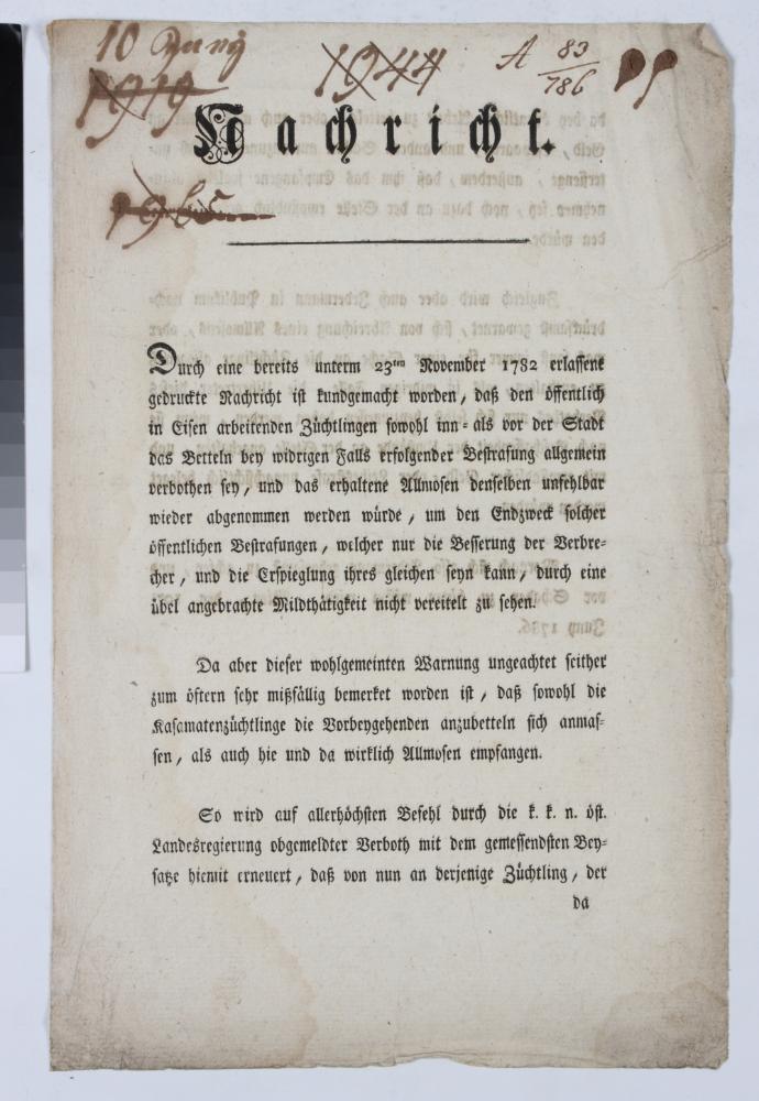 Zweiseitiger Druck. Langform Titel: „Nachricht. / Durch eine bereits unterm 23ten November 1782 erlassene gedruckte Nachricht ist kundgemacht worden, daß den oeffentlich in Eisen arbeitenden Zuechtlingen sowohl inn = als vor der Stadt das Betteln bey widrigen Falls erfolgender Bestrafung allgemein verbothen sey, und das erhaltene Allmosen denselben unfehlbar wieder abgenommen werden wuerde, um den Endzweck solcher oeffentlichen Bestrafungen, welcher nur die Besserung der Verbrecher, und die Erspieglung ihres gleichen seyn kann, durch eine uebel angebrachte Mildthaetigkeit nicht vereitelt zu sehen. / Da aber dieser wohlgemeinten Warnung ungeachtet seither zum oeftern sehr mißfaellig bemerket worden ist, daß sowohl die Kasamatenzuechtlinge die Vorbeygehenden anzubetteln sich anmassen, als auch hie und da wirklich Allmosen empfangen. […] Wien, den 10ten Juny 1786.“
