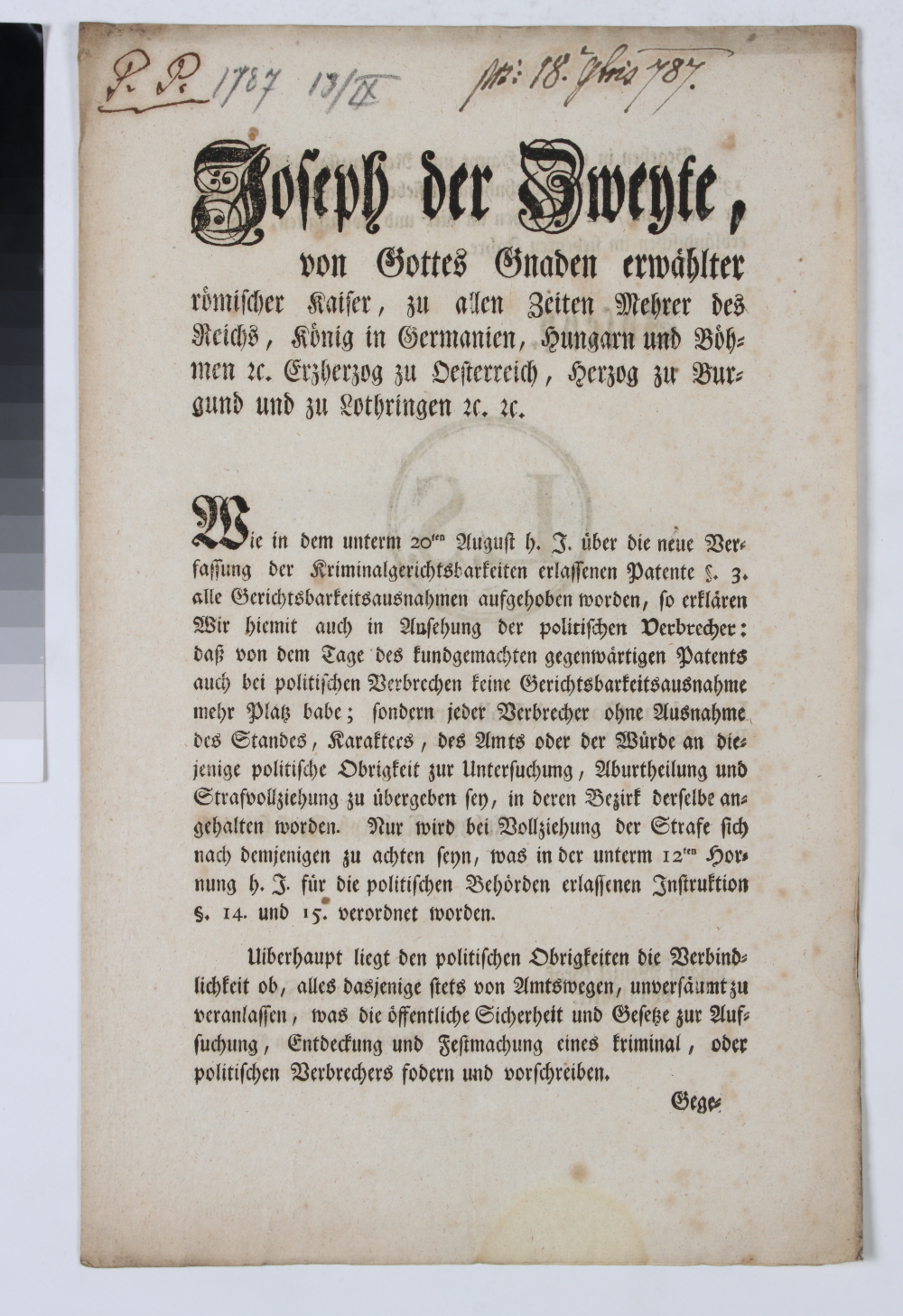 Zweiseitiger Druck. Langform Titel: „Joseph der Zweyte, […] Wie in dem unterm 20ten August h. J. Ueber die neue Verfassung der Kriminalgerichtsbarkeiten erlassenen Patente §. 3. alle Gerichtsbarkeitsausnahmen aufgehoben worden, so erklaeren Wir hiemit auch in Ansehung der politischen Verbrecher: daß von dem Tage des kundgemachten gegenwaertigen Patents auch bei politischen Verbrechen keine Gerichtsbarkeitsausnahme mehr Platz habe; sondern jeder Verbrecher ohne Ausnahme des Standes, Karakters, des Amts oder der Wuerde an diejenige politische Obrigkeit zur Untersuchung, Aburtheilung und Strafvollziehung zu uebergeben sey, in deren Bezirk derselbe angehalten worden. Nur wird bei Vollziehung der Strafe sich nach demjenigen zu achten seyn, was in der unterm 12ten Hornung h. J. Fuer die politischen Behoerden erlassenen Instruktion §. 14. imd 15. verordnet worden. […] Wien, den 13ten September, im siebenzehnhundert sieben und achtzigsten, unserer Regierung, […] Joseph. / L. S. / Leopoldus Comes à Kollowrat, Reg is Boh iae Sup us & A.A. pri mus Canc ius. / Johann Rudolph Graf Chotek. / Johann Wenzel Graf von Ugarte. / Ad Mandatum Sac ae. Caes o: Regiae Majestatis proprium. Anton Friedrich von Mayern.“