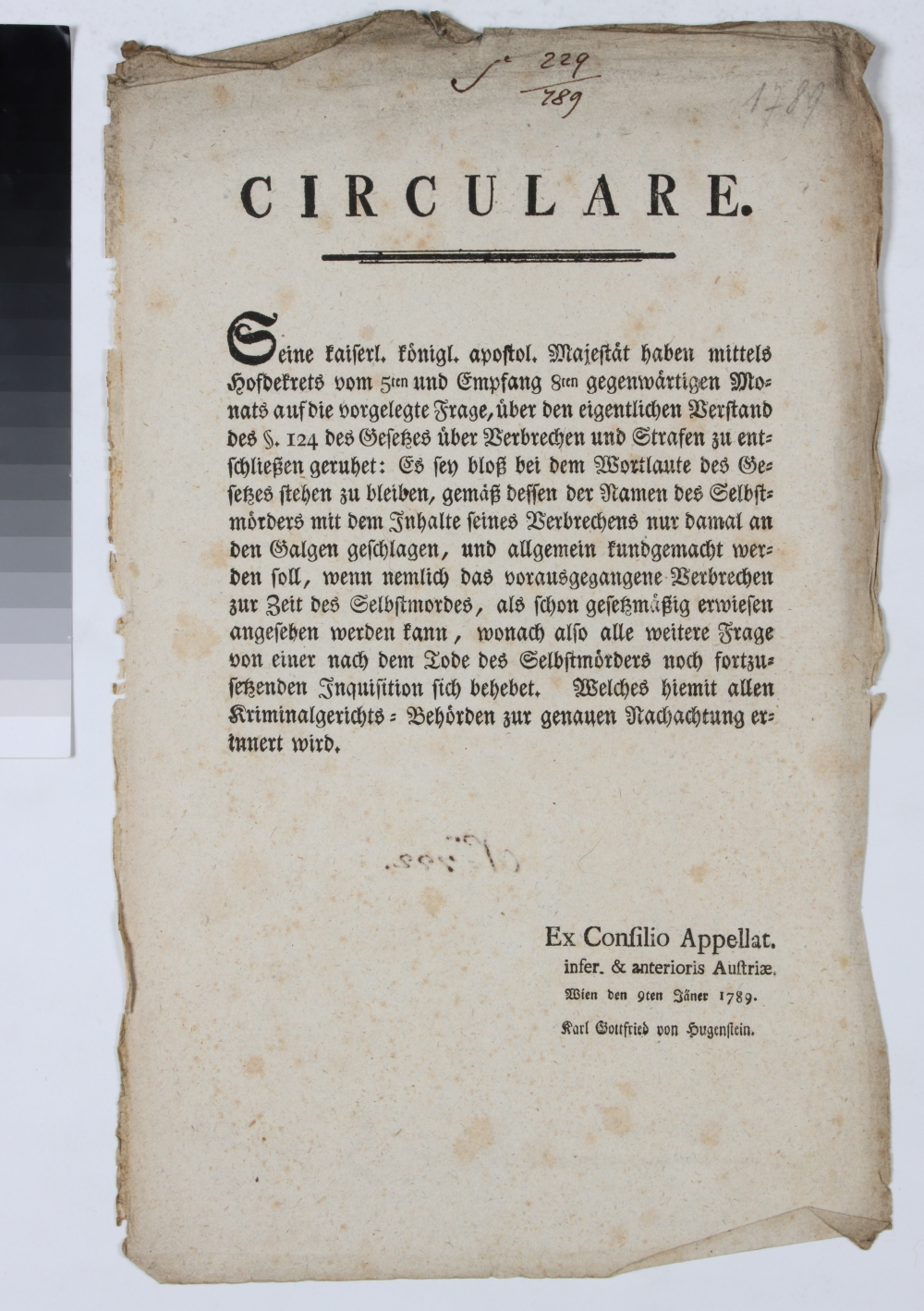 Einseitiger Druck. Langform Titel: „CIRCULARE. Seine kaiserl. koenigl. apostol. Majestaet haben mittels Hofdekrets vom 5ten und Empfang 8ten gegenwaertigen Monats auf die vorgelegte Frage, ueber den eigentlichen Verstand des §. 124 des Gesetzes ueber Verbrechen und Strafen zu entschließen geruhet: Es sey bloß bei dem Wortlaute des Gesetzes stehen zu bleiben, gemaeß dessen der Namen des Selbstmoerders mit dem Inhalte seines Verbrechens nur damal an den Galgen geschlagen, und allgemein kundgemacht werden soll, wenn nemlich das vorausgegangene Verbrechen zur Zeit des Selbstmordes, als schon gesetzmaeßig erwiesen angesehen werden kann, wonach also alle weitere Frage von einer nach dem Tode des Selbstmoerders noch fortzusetzenden Inquisition sich behebet. Welches hiemit allen Kriminalgerichts= Behoerden zur genauen Nachachtung erinnert wird. / Ex Consilio Appelllat. infer. & anterioris Austriae. / Wien den 9ten Jäner 1789. / Karl Gottfried von Hugenstein.“