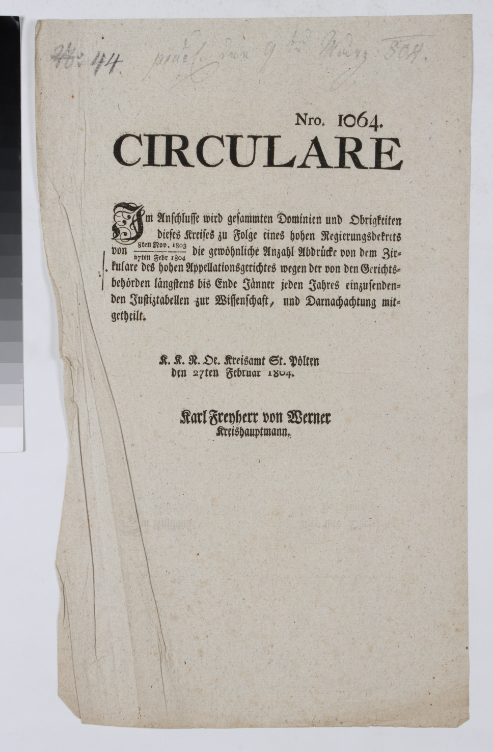 Einseitiger Druck. Langform Titel: „CIRCULARE Im Anschlusse wird gesammten Dominien und Obrigkeiten dieses Kreises zu Folge eines hohen Regierungsdekrets von 8ten Nov. 1803/27ten Febr 1804 die gewoehnliche Anzahl Abdruecke von dem Zirkulare des hohen Appellationsgerichtes wegen der von den Gerichtsbehoerden laengstens bis Ende Jaenner jeden Jahres einzusendenden Justiztabellen zur Wissenschaft, und Darnachachtung mitgetheilt. / K. K. N. Oe. Kreisamt St. Poelten den 27ten Februar 1804. / Karl Freyherr von Werner / Kreishauptmann.“