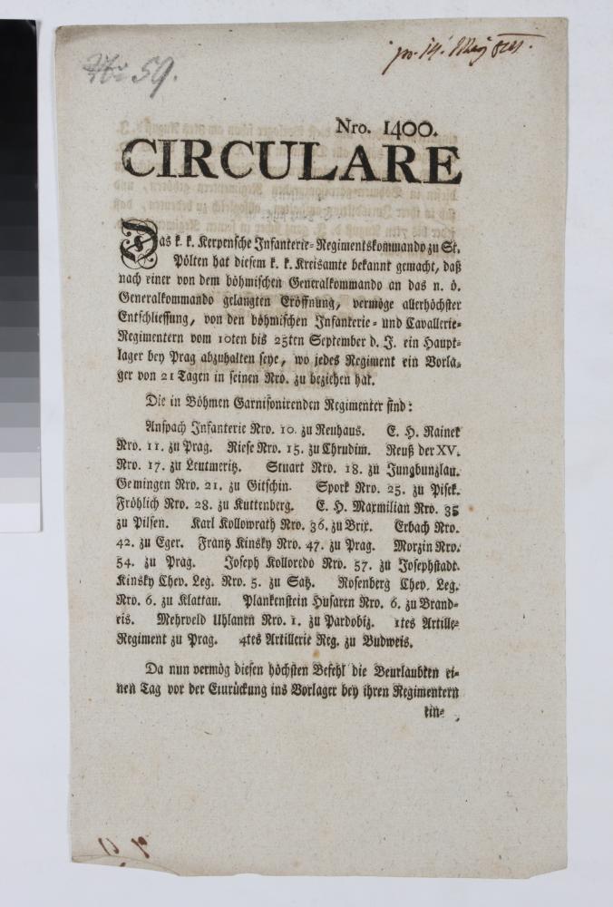 „CIRCULARE Das k. k. Kerpensche Infanterie=Regimentskommando zu St. Poelten hat diesem k. k. Kreisamte bekannt gemacht, daß [...] von den boehmischen Infanterie= und Cavallerie=Regimentern vom 10ten bis 25ten September d. J. ein Hauptlager bey Prag abzuhalten seye, wo jedes Regiment ein Vorlager von 21 Tagen in seinen Rro. zu beziehen hat. [...] / K. K. N. Oe. Kreisamt St. Poelten am 17ten Maerz 1804. [...]“