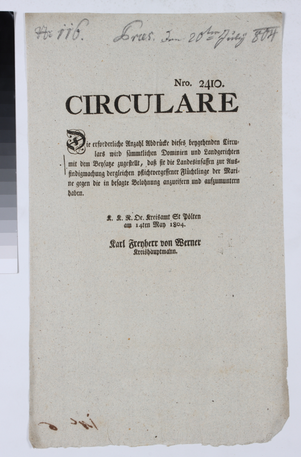Einseitiger Druck. Langform Titel: „CIRCULARE Die erforderliche Anzahl Abrdruecke dieses beygehenden Circulars wird saemmtlichen Dominien und Landgerichten mit dem Beysatze zugestellt, daß sie die Landesinsassen zur Ausfindigmachung dergleichen pflichtvergessener Fluechtlinge der Marine gegen die in besagte Belohnung anzeifern und aufzumuntern haben. / K. K. N. Oe. Kreisamt St. Poelten am 14ten May 1804. / Karl Freyherr von Werner / Kreishauptmann.“