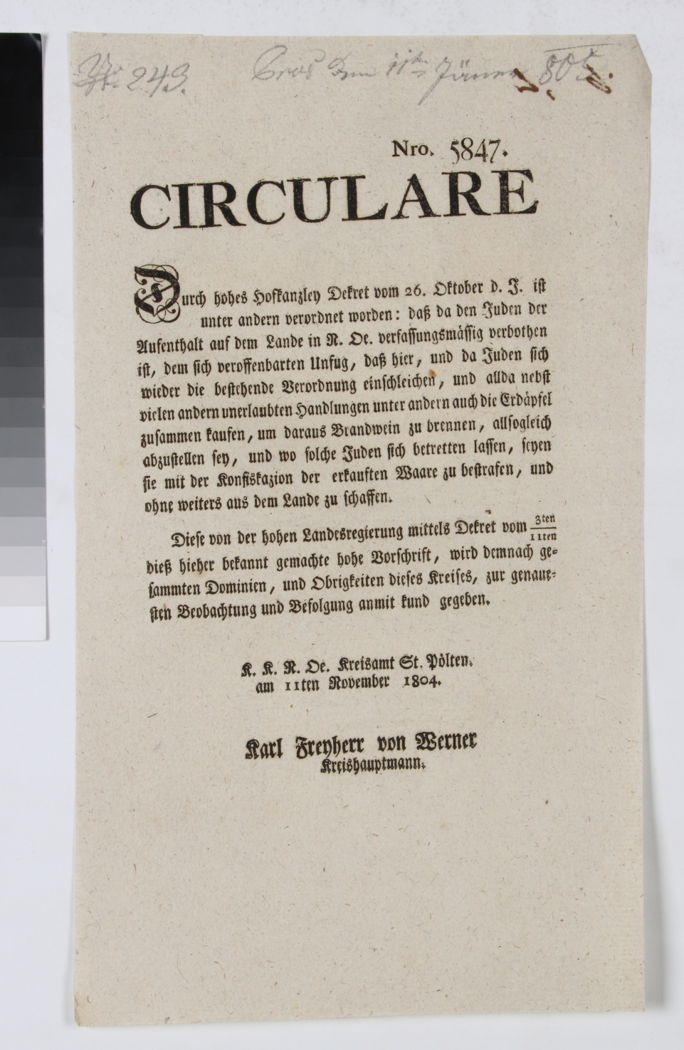 Einseitiger Druck. Langform Titel: „CIRCULARE Durch hohes Hofkanzley Dekret vom 26. Oktober d. J. ist unter andern verordnet worden: daß da den Juden der Aufenthalt auf dem Lande in N. Oe. verfassungsmaessig verbothen ist, dem sich veroffenbarten Unfug, daß hier, und da Juden sich wieder die bestehende Verordnung einschleichen, und allda nebst vielen andern unerlaubten Handlungen unter andern auch die Erdaepfel zusammen kaufen, um daraus Brandwein zu brennen, allsogleich abzustellen sey, und wo solche Juden sich betretten lassen, seyen sie mit der Konfiskazion der erkauften Waare zu bestrafen, und ohne weiters aus dem Lande zu schaffen. [...] / K. K. N. Oe. Kreisamt St. Poelten am 11ten November 1804. / Karl Freyherr von Werner / Kreishauptmann.“