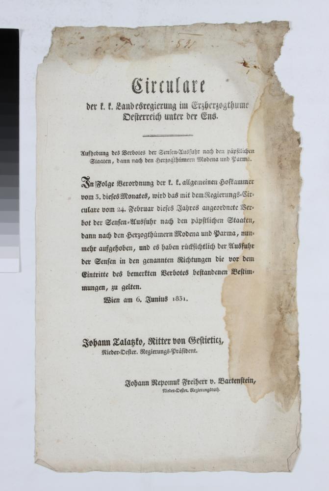 Einseitiger Druck. Langform Titel: „Circulare der k. k. Landesregierung im Erzherzogthume Oesterreich unter der Ens [sic!]. / Aufhebung des Verbotes der Sensen=Ausfuhr nach den paepstlichen Staaten, dann nach den Herzogthuemern Modena und Parma. […] Wien am 6. Junius 1831. / Johann Talatzko, Ritter von Gestieticz, Nieder. Oester. Regierungs=Präsident. / Johann Nepomuk Freiherr v. Bartenstein, Nieder= Oester. Regierungsrath.“