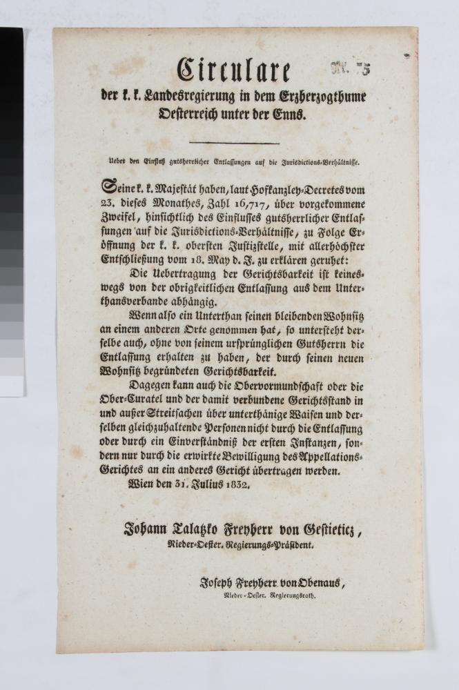Einseitiger Druck. Langform Titel: „Circulare der k. k. Landesregierung im Erzherzogthume Oesterreich unter der Enns. / Ueber den Einfluß gutsherrlicher Entlassungen auf die Jurisdictions=Verhaeltnisse. […] Wien am 31. Julius 1832. / Johann Talatzko Freyherr von Gestieticz. Nieder= Oester. Regierungs=Präsident. / Joseph Freyherr von Obenaus. Nieder= Oester. Regierungsrath.“