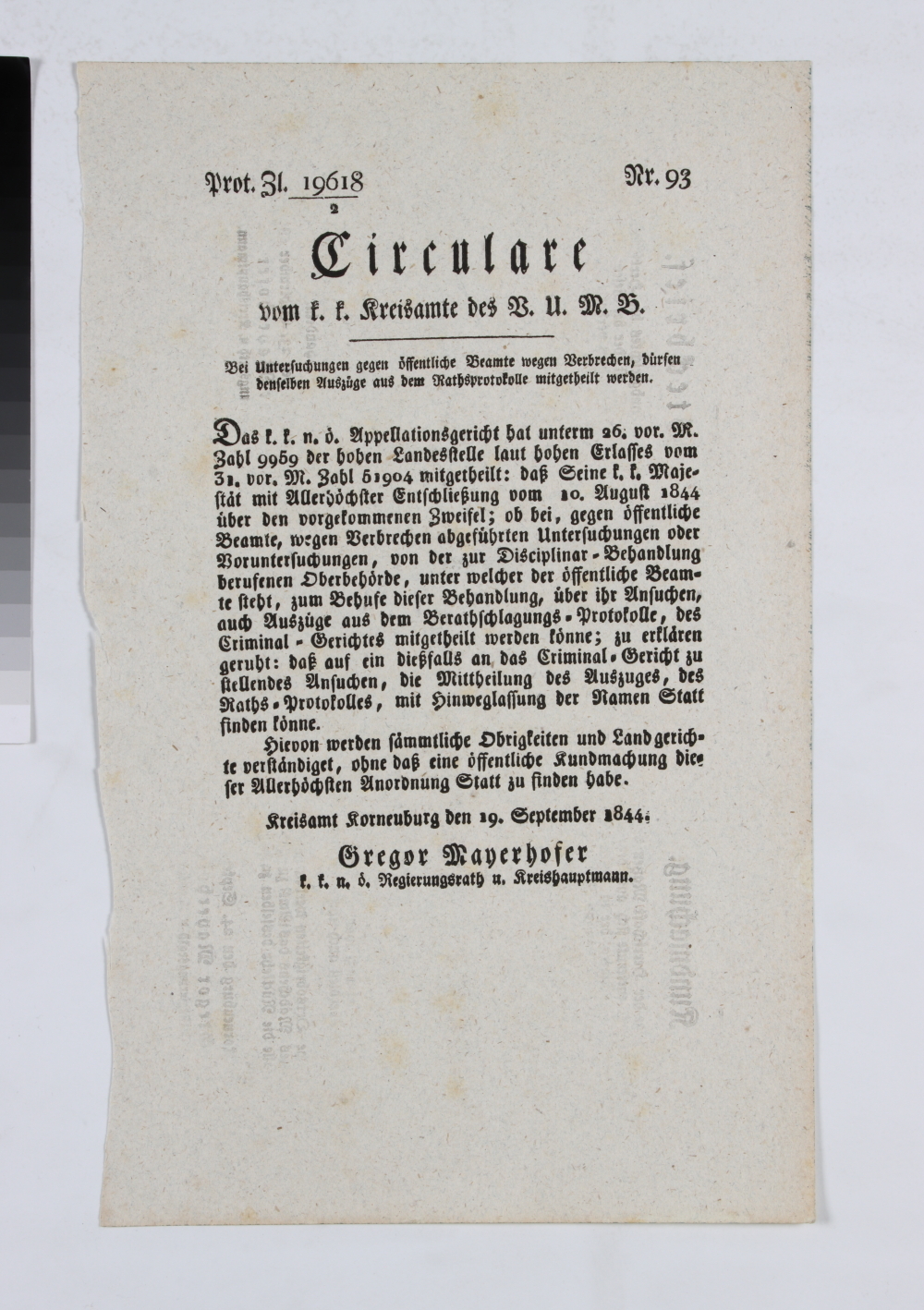 Einseitiger Druck. Langform Titel: „CIRCULARE vom k. k. Kreisamte des V. U. M. B. / Bei Untersuchungen gegen oeffentliche Beamte wegen Verbrechen. duerfen denselben Auszuege aus dem Rathsprotokolle mitgetheilt werden. [...] Kreisamt Korneuburg den 19. September 1844. / Gregor Mayerhofer / k. k. n. oe. Regierungsrath u. Kreishauptmann.“