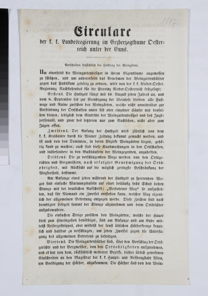 Zweiseitiger Druck. Langform Titel: „Circulare der k. k. Landesregierung im Erzherzogthume Oesterreich unter der Enns. / Vorschriften hinsichtlich der Hüthung der Weingärten. […] Wien am 20. Jänner 1847. / Johann Talatzko Freiherr v. Gestieticz. k. k. Nieder=Oest. Regierungs=Präsident. / Anton Freiherr v. Lago. k. k. Nieder=Oester. Regierungs=Vice=Prasident. / Johann Wenzel Regner. Ritter v. Bleileben. k. k. Nieder=Oester. Regierungsrath.“