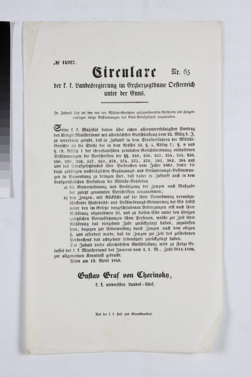 Einseitiger Druck. Langform Titel: „Circulare der k. k. Landesregierung im Erzherzogthume Oesterreich unter der Enns. / In Zukunft sind bei den von den Militär=Gerichten aufzunehmenden Verhören und Zeugenaussagen einige Bestimmungen des Civil=Strafgesetzes anzuwenden. […] Wien am 12. April 1849. / Gustav Graf von Chorinsky. k. k. niederöster. Landes=Chef.“