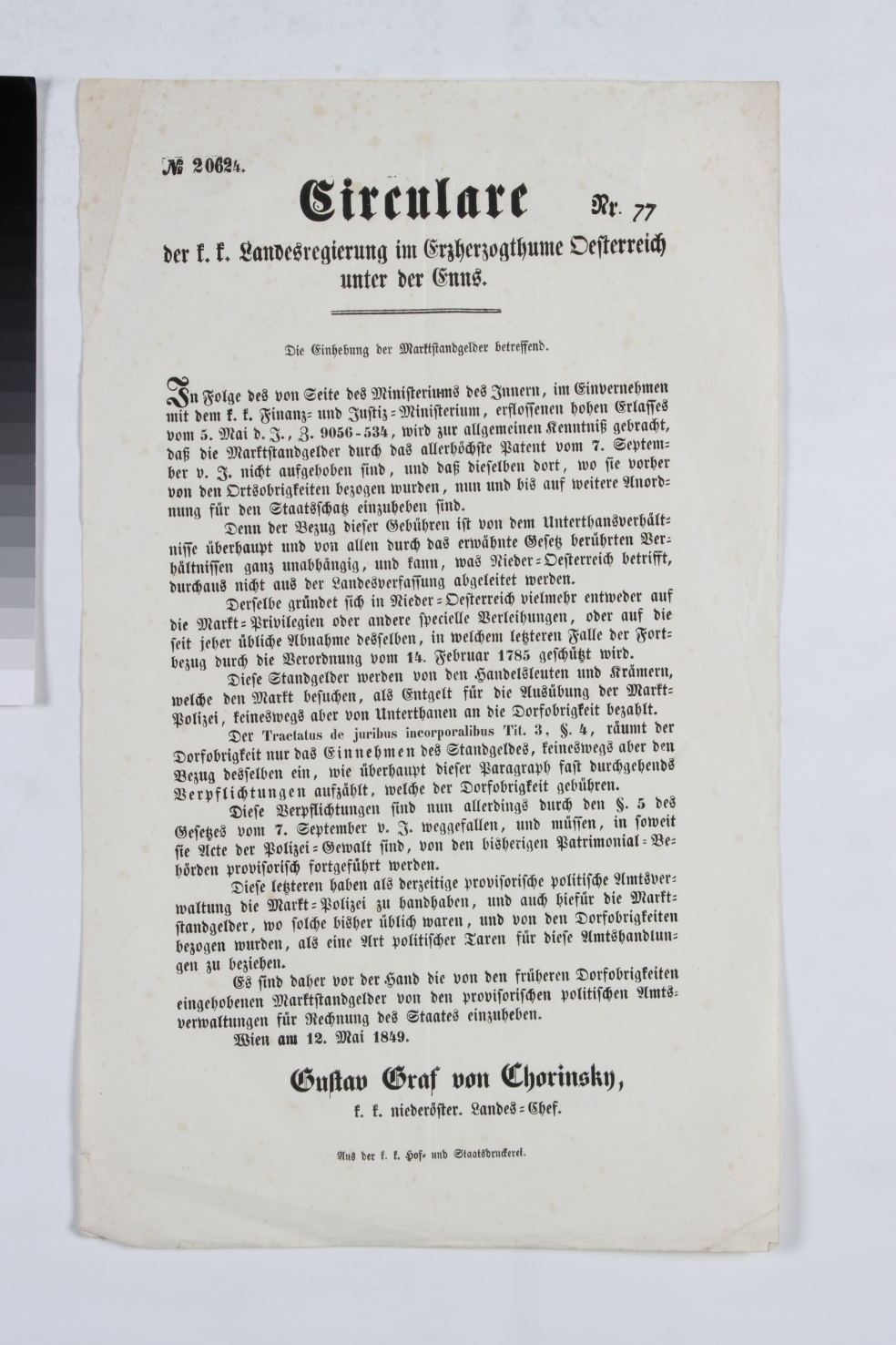 „Circulare der k. k. Landesregierung im Erzherzogthume Oesterreich unter der Enns. / Die Einhebung der Marktstandgelder betreffend. […] Wien am 12. Mai 1849. / Gustav Graf von Chorinsky. k. k. niederöster. Landes=Chef.“