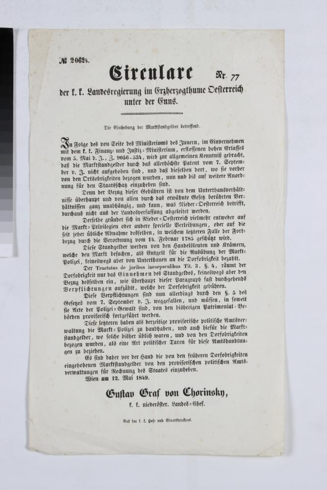 Einseitiger Druck. Langform Titel: „Circulare der k. k. Landesregierung im Erzherzogthume Oesterreich unter der Enns. / Die Einhebung der Marktstandgelder betreffend. […] Wien am 12. Mai 1849. / Gustav Graf von Chorinsky. k. k. niederöster. Landes=Chef.“