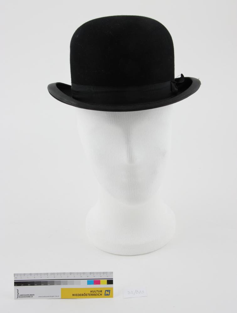 Schwarze Melone mit Ripsband und Klang, Krempe mit Ripsband eingefaßt, breites Schweißband aus Leder mit eingezogenem Seidenbändchen und Goldprägung, in Falten gelegtes Seidenfutter und Hutdach aus Moire mit goldenem Firmenaufdruck und Signatur.