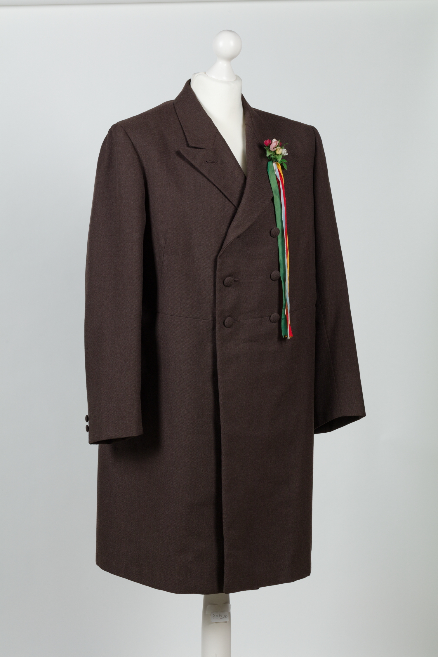 Brauner doppelreihiger Gehrock mit angestecktem Kunstblumensträußchen und bunten Bändern, überzogene Knöpfe. Zwei Knöpfe an der Rückseite, Futter braun mit zwei Innentaschen.