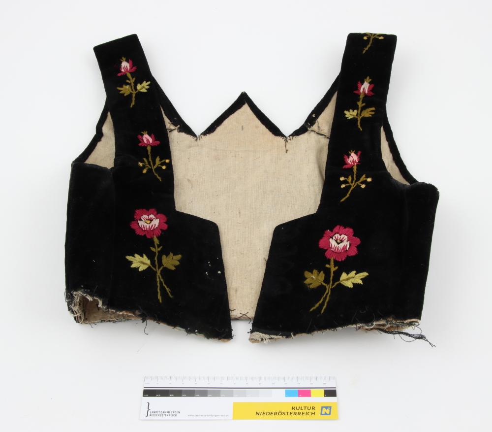 Schwarzes Samtmieder mit Rosen in Weinrot/Weiß/Grün in Plattstichstickerei bestickt. Auf Karton (teilw. mit aufkaschiertem Wollstoff) aufgearbeitet, mit naturfarbenem Leinen gefüttert, Rock und Miederösen wurden abgetrennt.