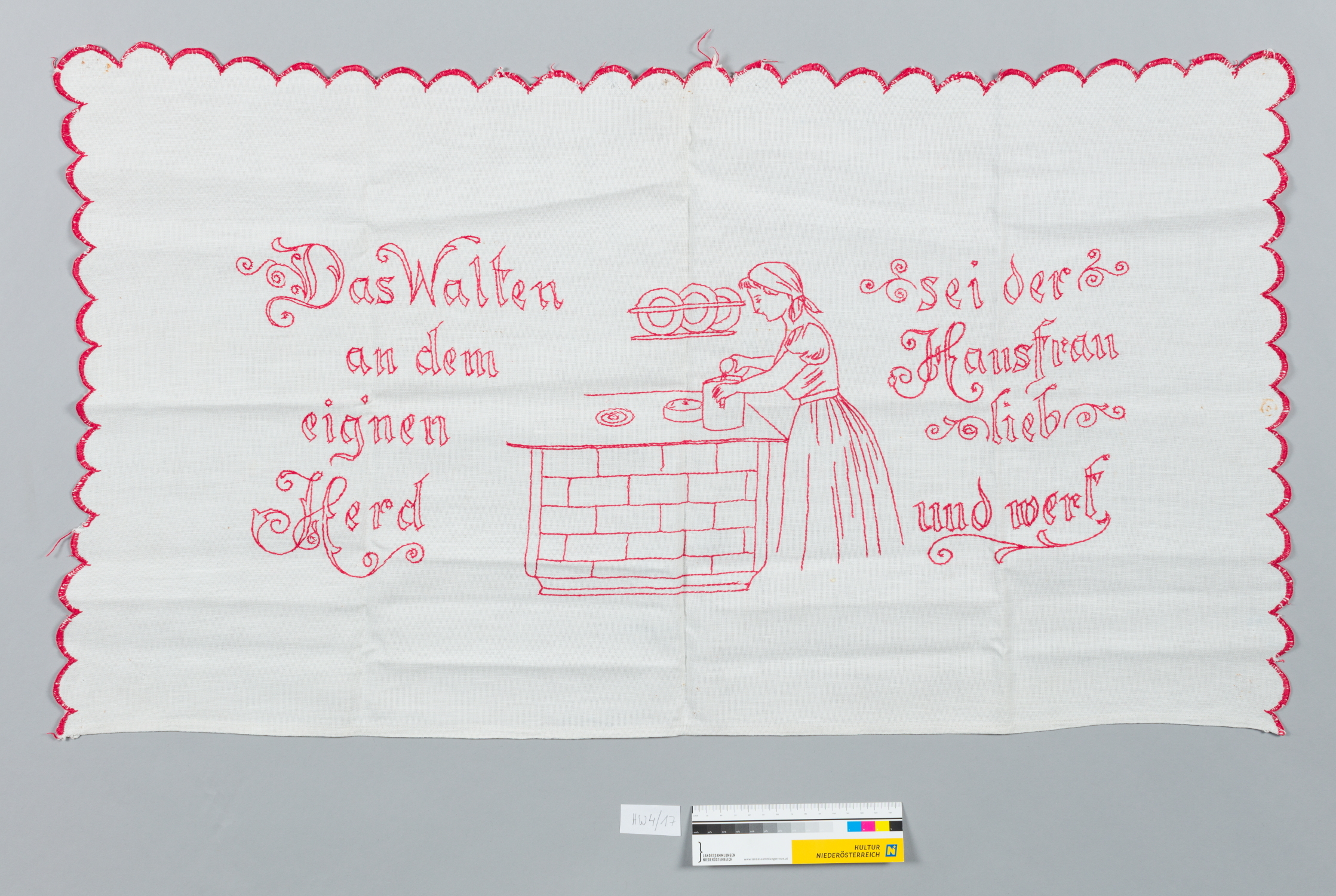 Rote Stielstichstickerei auf weißem Grund mit Hausfrau am Herd und Küchenspruch, drei gebogte Kanten, Unterkante abgesteppt.