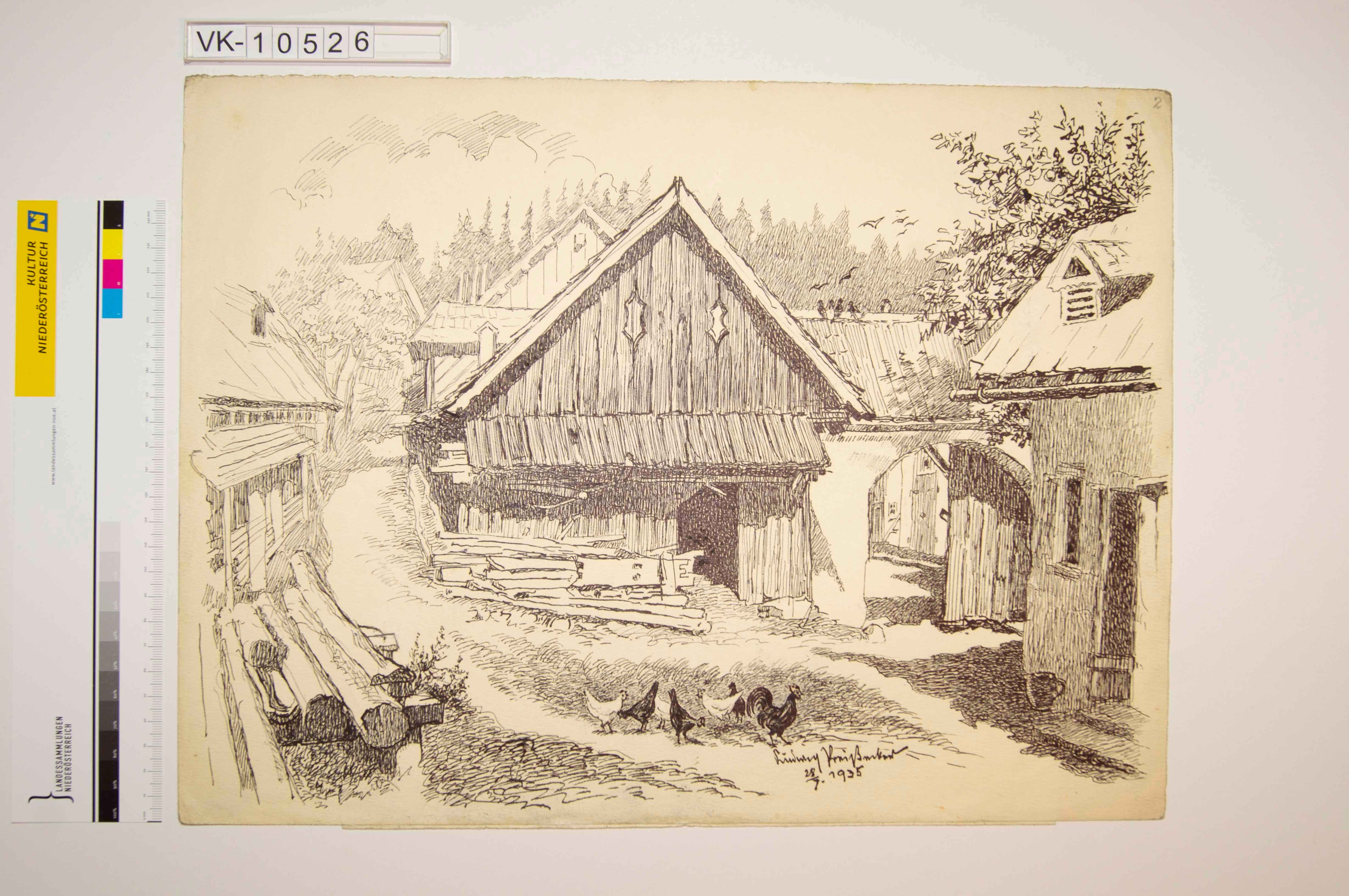 Zeichnung aus der Serie Waldviertler Heimatbilder: "Plankl-Hof", sign. Ludwig Preißecker, 28.9.1935