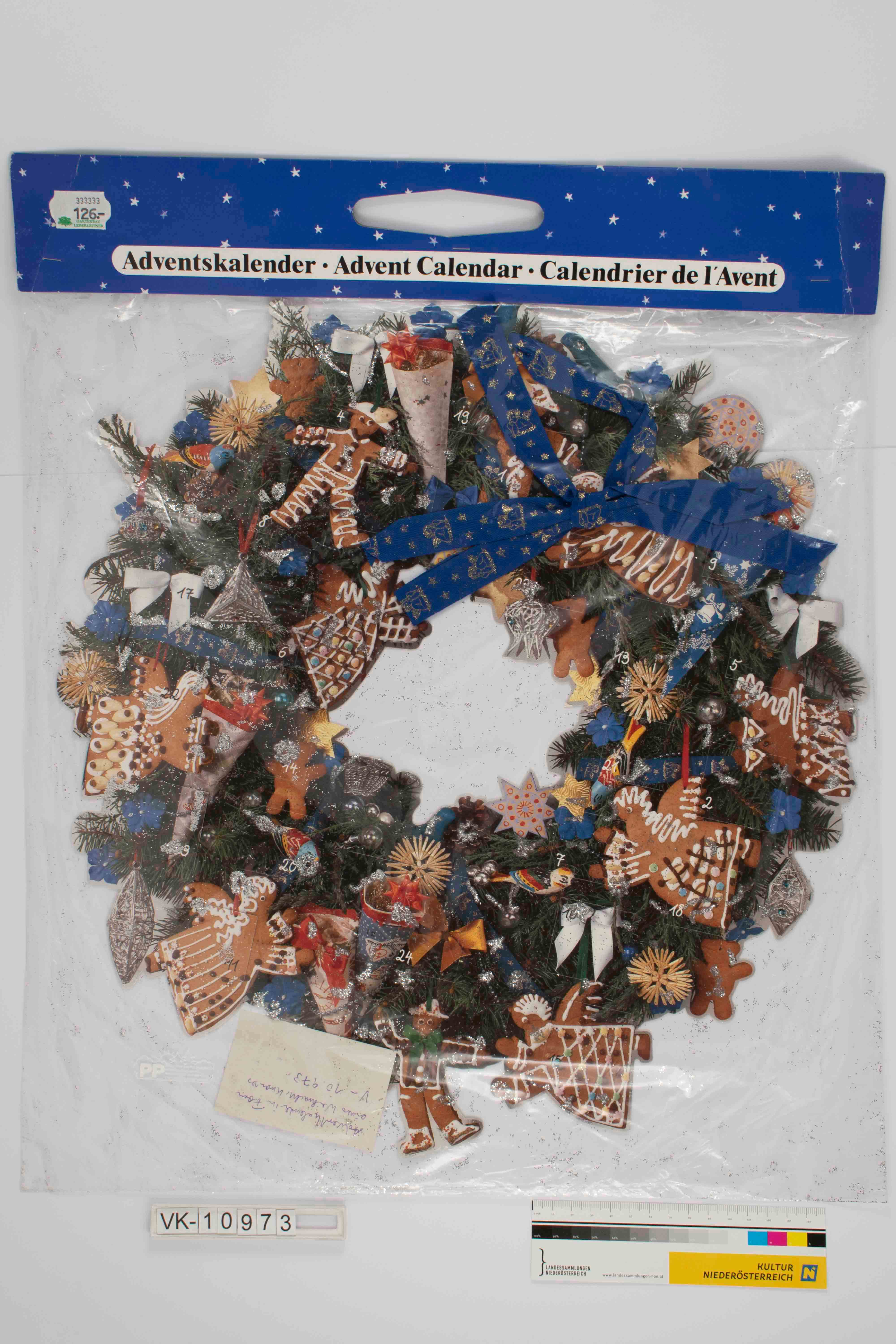 Hängeadventkalender in Kranzform mit blauer Stoffschleife und beglimmert; weihnachtlicher Türkranz aus Reisigzweigen mit Lebkuchenfiguren, Strohsternen, Anhängern und Schleifchen, viereckige Türchen; auf Rückseite Verlagsangaben, auf Originalverpackung Preisschild.