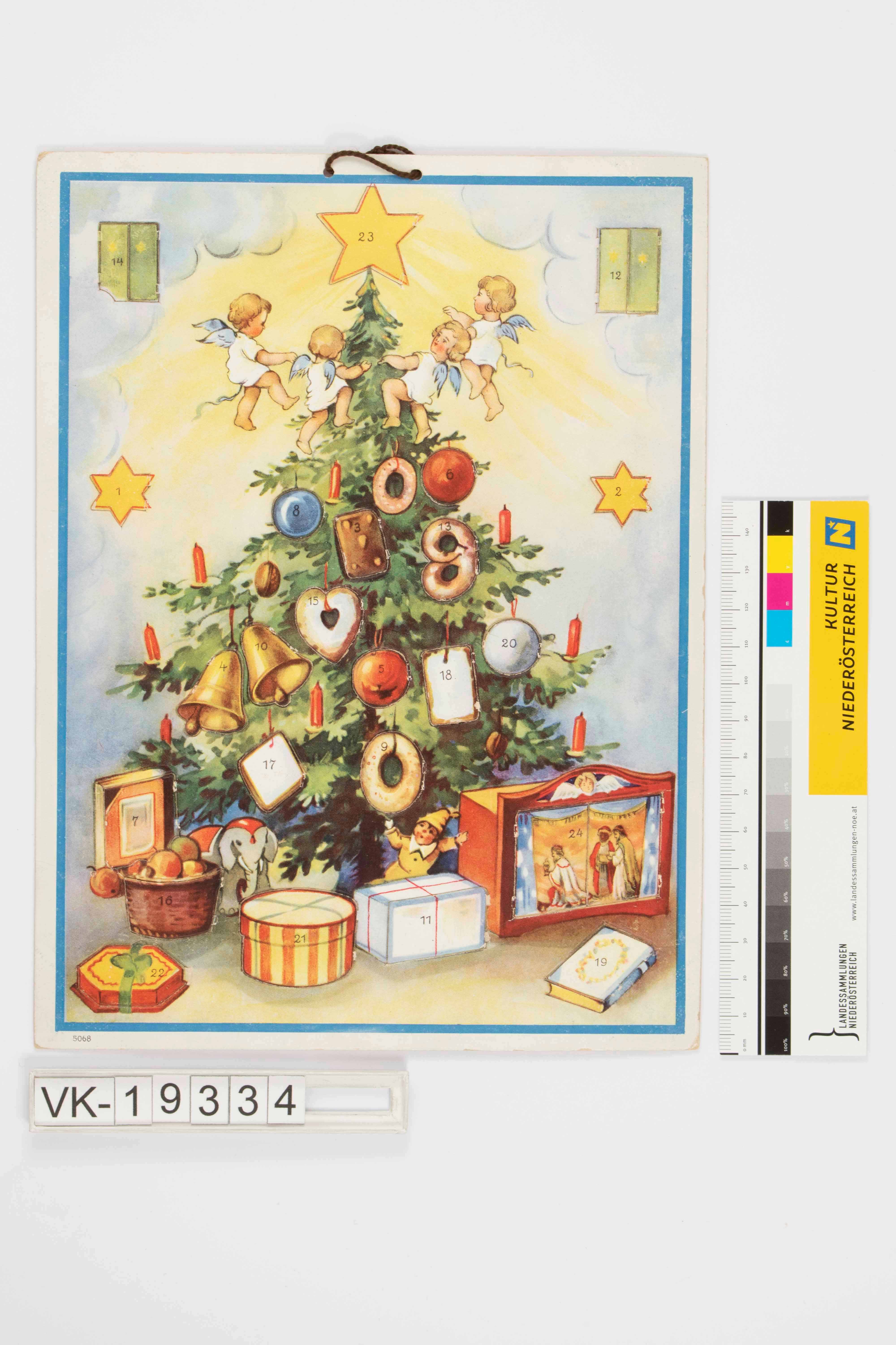 Hängeadventkalender, Hochformat, mit doppelter gestanzter Aufhängelochung und brauner Schnur; weiß-blau umrandetes Bild mit traditionell geschmücktem Christbaum, darunter Geschenke und rund um den Baum oben vier kleine Engelchen; Hintergrund aus Wolken und Stern; unterschiedlich geformte Türchen; mit dünnem rosa Papier hinterklebt; links unten Nummer 5068, ansonsten keine Herkunftsangaben, unleserlicher handschriftlicher Vermerk rückseitig.
