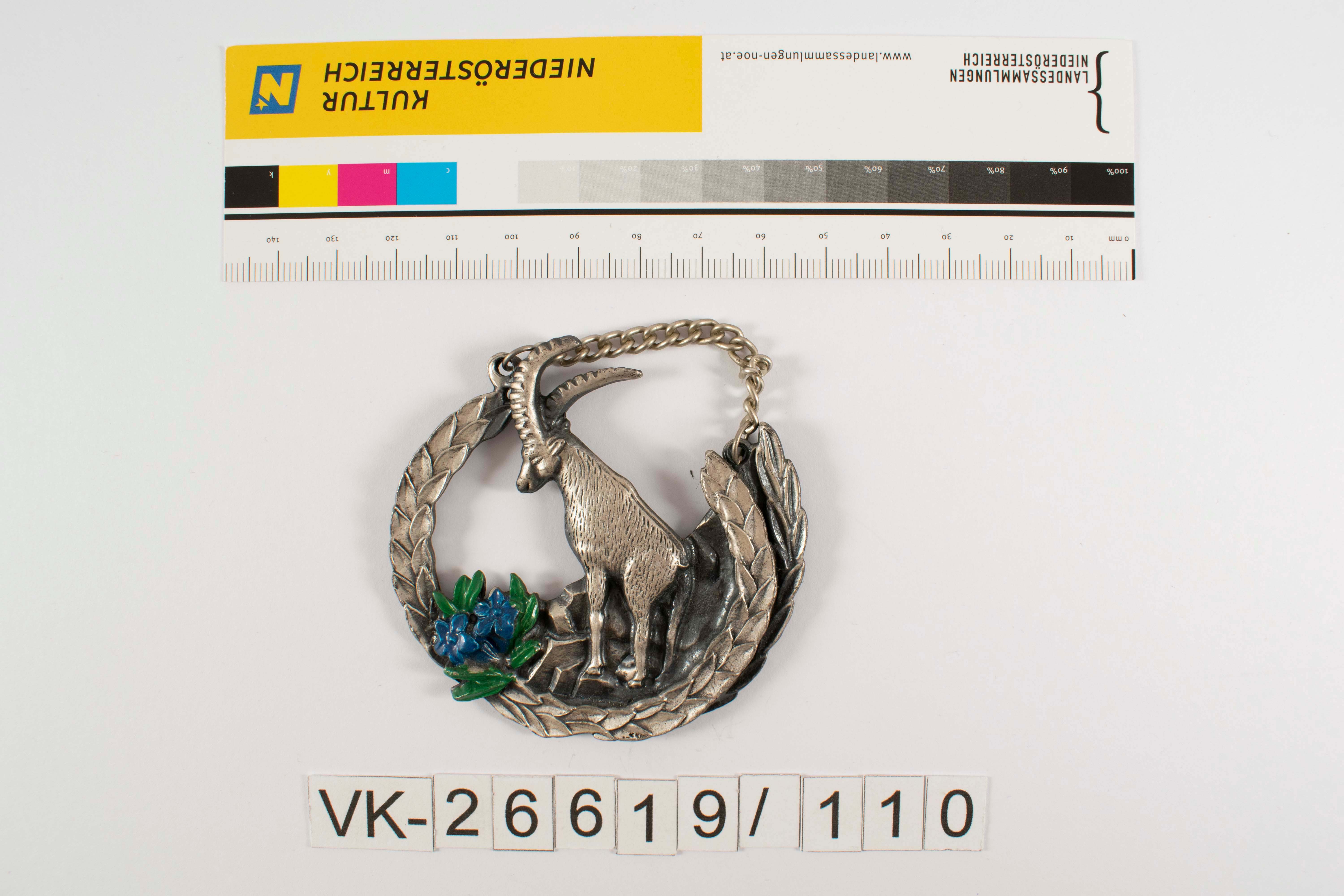 Wanderorden mit reliefartigem, U-förmigem Lorbeerkranzmotiv; darauf stehend Mufflon in stilisierter Felslandschaft mit blau und grün gefärbtem Enzian; links und rechts etwas schräg versetzte Aufhängeösen an welchen eine vielgliedrige Kette befestigt ist; keine Herstellerangaben.