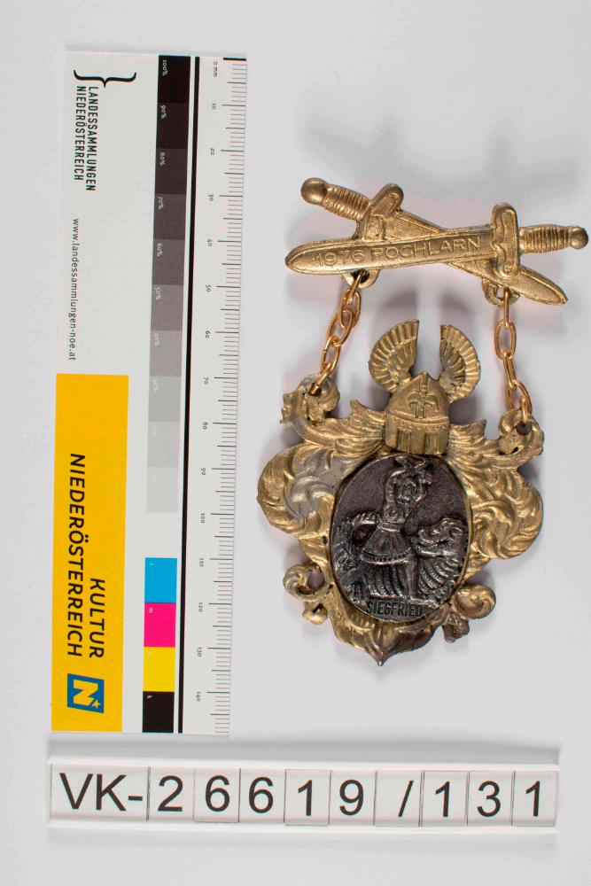 Wandernadel aus zwei Teilen welche mit einer Kette verbunden sind; unterer Teil besteht aus einem goldfarbenen stilisierten wappenartigen Relief mit Blattranken und geflügeltem Helm, mittig Weißmetallmedaillon mit Drachentötermotiv angebracht; beschriftet mit Siegfried; durch zwei Lochungen oben beidseitig mit zwei goldenen Ketten mit Nadelkörper verbunden; oberer Teil zwei gekreuzte Schwerter mit der Aufschrift 1967 Pöchlarn mit zwei untenstehenden Ösen; rückseitig Nadel mit spiralförmig gebogener Spannung und U-förmig gebogener Nadelrast.