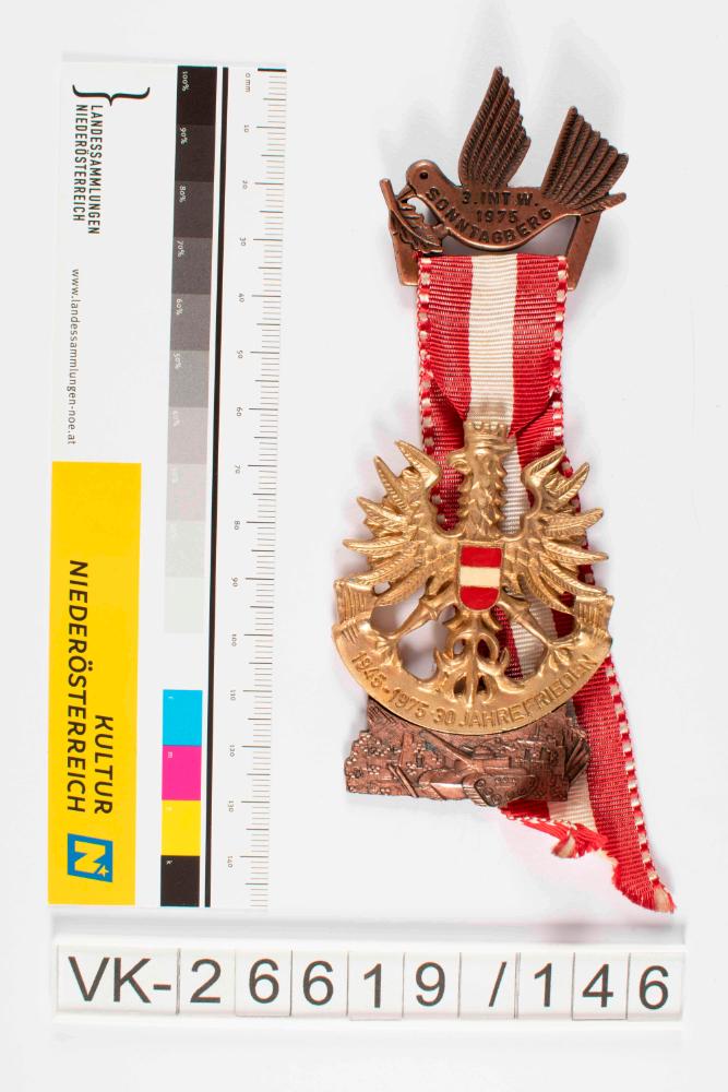 Mehrteilige Wandernadel, Anhänger in Form eines durchbrochen gegossenem Bundesadlers mit Banner in seinen Krallen mit der Auschrift 1945-1975 30 Jahre Frieden, mittig rot und weiß emaillierte österreichische Flagge; darunter angenietet Bronzeplakette mit reliefartiger Darstellung eines Panzers und Runinen; mit rot-weiß-rotem Band verbunden mit bronzenem Nadelkörper in Form einer Taube mit Zweig im Schnabel, auf der Taube steht 3. Int. W. 1975 Sonntagberg; rückseitig Nadel mit Gelenk und hakenförmig nach unten gebogener Nadelrast sowie Herstellerangaben.