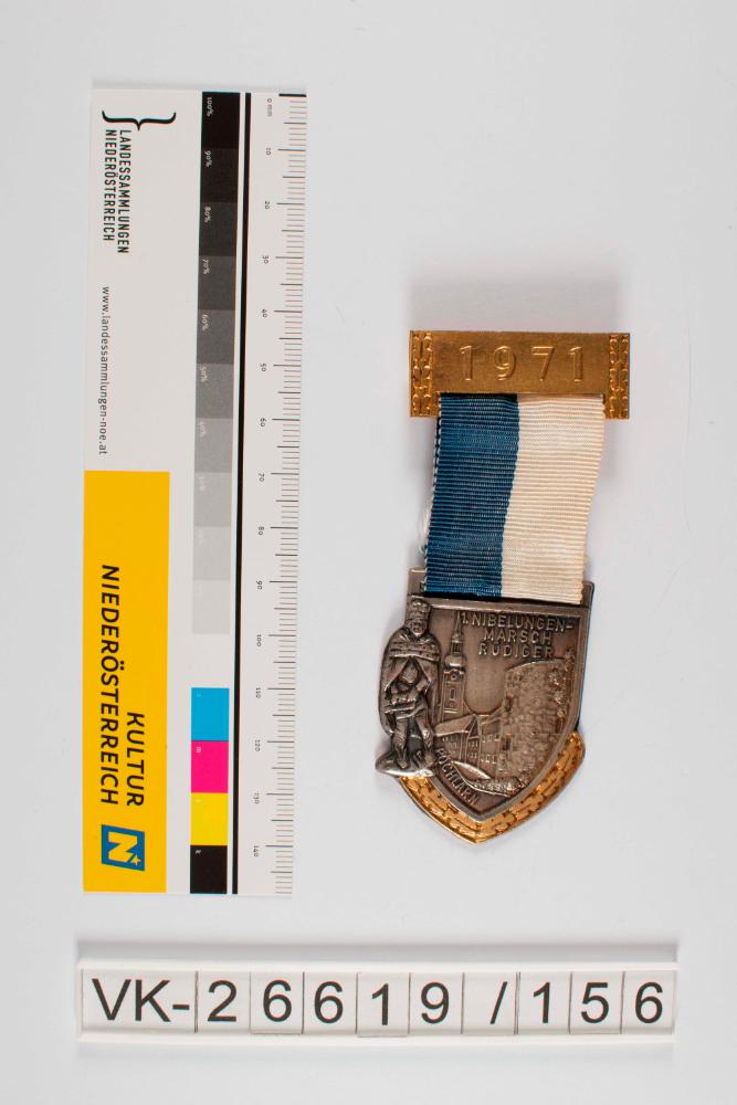 Mehrteilige Wandernadel aus wappenförmigem Anhänger, blau-weißem Stoffband und querrechteckigem Nadelkörper; Anhänger hat oben eine querrechteckige schmale Ausnehmung für das Band und ist ein Wappen mit einem Relief eines Adeligen links außen, Stadtdarstellung sowie der Aufschrift 1. Nibelungen-Marsch Rüdiger Pöchlarn; Nadelkörper ist gold und querrechteckig, links und rechts Lorbeerblattdekor und mittig beschriftet mit der Jahreszahl 1971; rückseitig Nadel mit spiralförmiger Spannung und U-förmig gebogener Rast sowie Herstellerangaben.