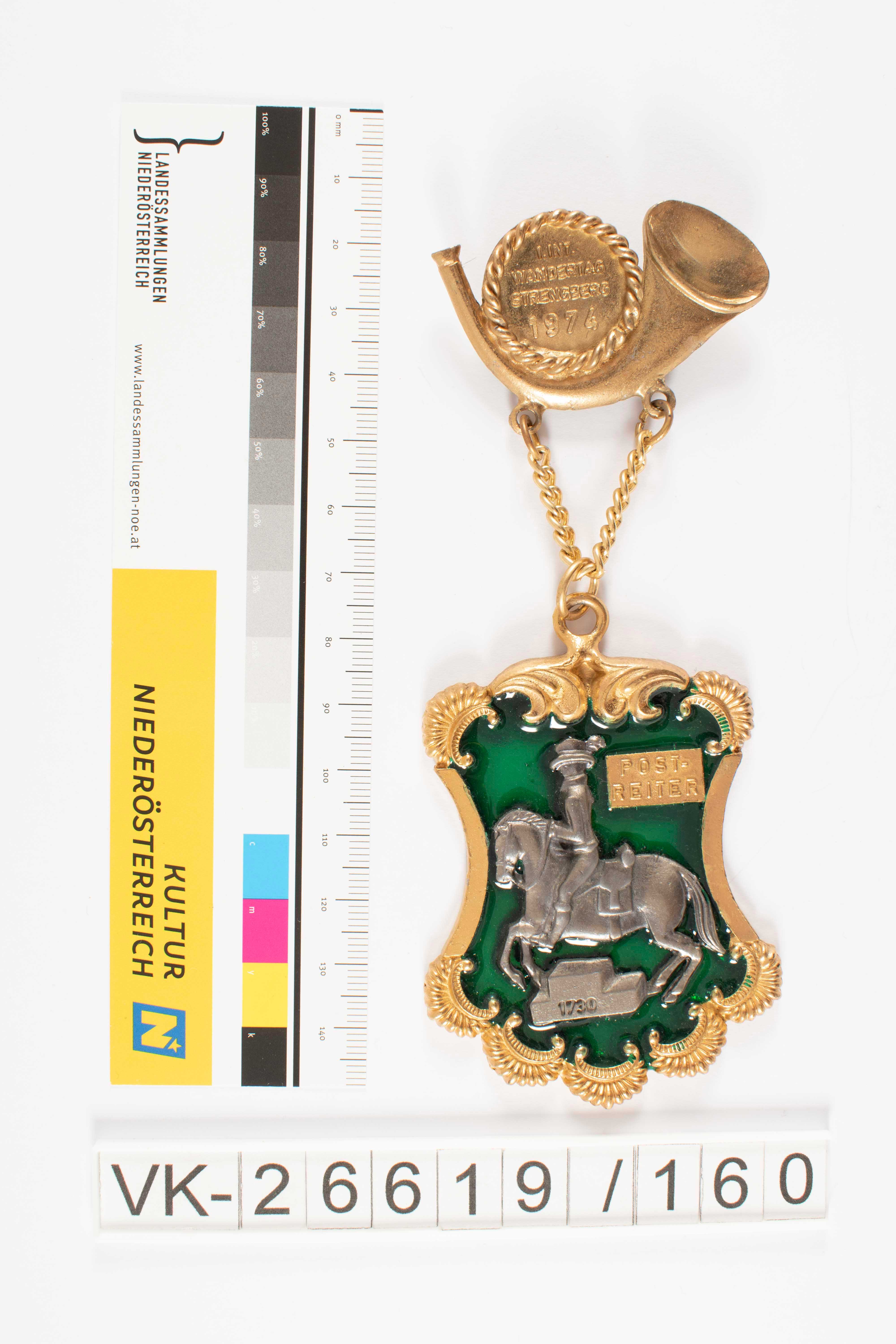 Mehrteilige Wandernadel, schwerer goldener, hochlänglicher Anhänger mit geschwungener Kannelurverzierung und mittig eingefügter Reiterdarstellung und der Jahreszahl 1730, mit grünem Kunststoff ausgegossen, oben mittig relativ große Aufhängeöse durch welche eine Kette mit Ring angebracht ist; Nadelkörper in Form eines Posthorns mit zwei untenstehenden Ösen und mittiger Aufschrift 1. Int. Wandertag Strengbert 1974; rückseitig Nadel mit Gelenk und Sicherheitsverschluss sowie Herstellerangaben.