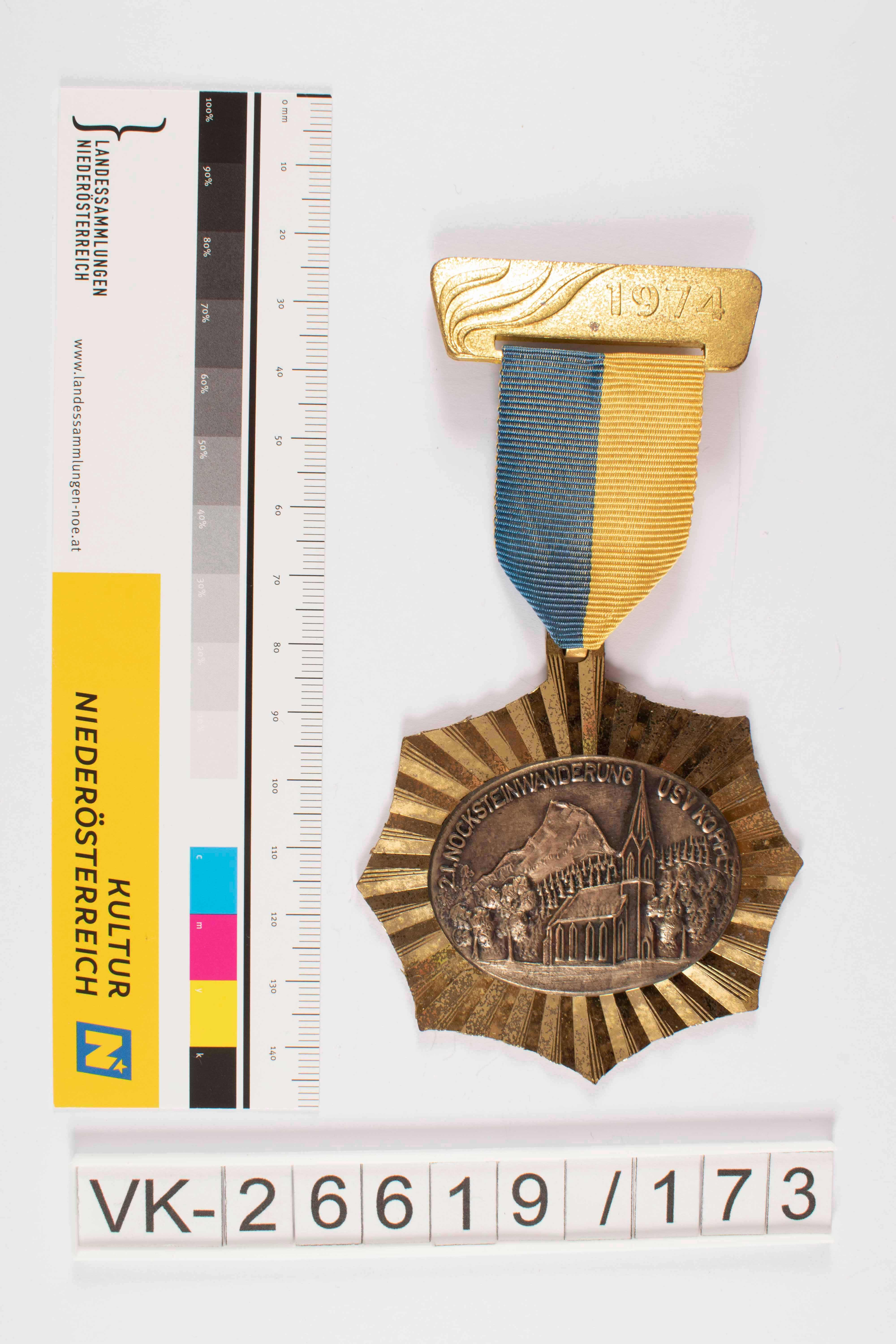 Mehrteilige Wandernadel; Buntmetallanhänger in achtstrahliger Sternform mit Strahlendekor und querovaler, mittig aufgeklebter Weißmetallplakette, Kirchen- und Landschaftsdarstellung mit der oben bogenförmig umlaufenden Aufschrift 2. I. Nocksteinwanderung USV Koppl; oben mittig runde Aufhängeöse und Haken und blau-gelbes Band; Nadelkörper quertrapezförmig mit Ausnehmung für das Band und links Blattdekor und rechts Jahreszahl 1974; rückseitig Nadel mit spiralförmiger Nadelspannung und U-förmig gebogener Rast.