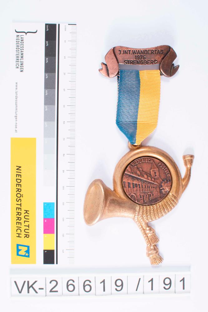 Mehrteilige Wandernadel mit Anhänger in Posthornform mit Umwicklung und Bommeln; mittig eingeklebte bronzene Plakette mit Darstellung eines Gebäudes und der Beschriftung Historisch Postgeb., oben mittig runde Aufhängeöse und blau-gelbes Band; Nadelkörper in Form eines Banners mit Ausnehmung für das Band und Aufschrift 3. Int. Wandertag 1976 Strengberg; rückseitig Nadel mit Gelenk und hakenförmig gebogener Nadelrast sowie Herstellerangaben.