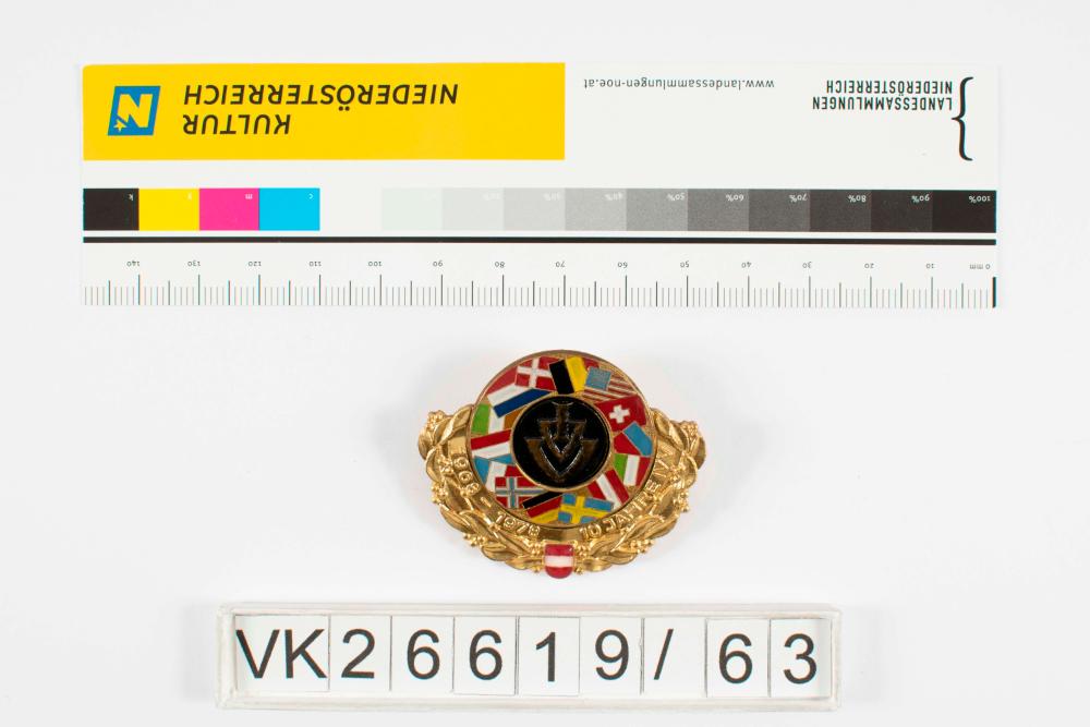 Wandernadel aus goldenem Buntmetall; runter Körper welcher um die untere Hälfte von Blätterrankenmotiv und Aufschrift umrahmt wird (1968-1978 10 Jahre), unten kleine Österreichflagge, mittig Logo IVV auf schwarzem Hintergrund in buntem, kunststoffüberzogenem Kreis mit unterschiedlichen Flaggen der IVV Mitglieder; rückseitig Herkunftsangaben.