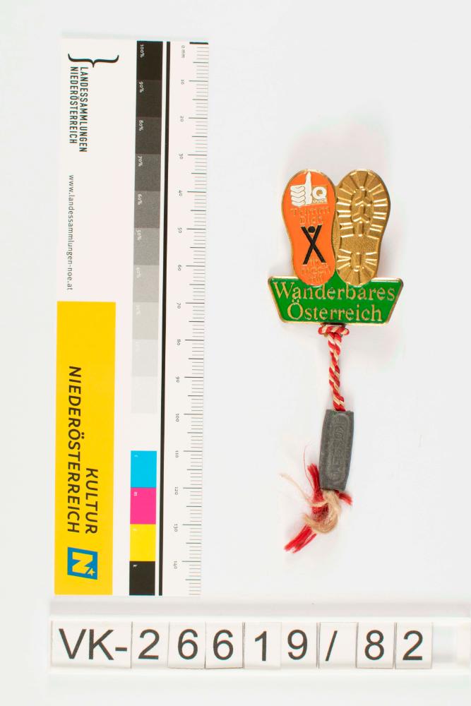 Wandernadel aus Buntmetall mit oranger und grüner Emaillierung; trapezförmiges grünes Feld unten mit der Aufschrift Wanderbares Österreich, darüber zwei Wanderschuhabdrücke, auf dem linken steht Quick, Trimm Dich fit mach mit und schwarzes Logo mit X-förmigem Männchen; untenstehend eckige Öse durch welche eine rot-weiße Kordel gefädelt wurde mit einer länglichen, schweren Weißmetallfädelperle mit der Aufschrift Kössen; horizontale Nadel rückseitig mit spiralförmiger Nadelspannung und doppelhakenförmig gebogener Rast.
