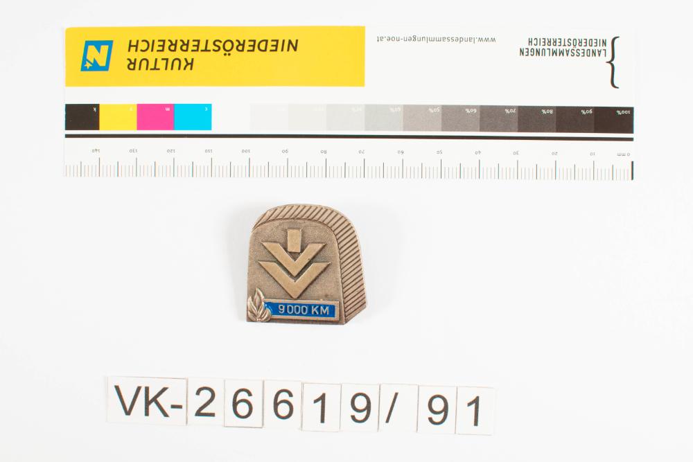 Wandernadel in verkehrt U-förmiger Form; links unten kleines Lorbeermotiv und mittig querrechteckige, blau hinterlegte Beschriftung 9000 km; mittig erhabenes Logo IVV; rechts umlaufend gerillte Umrahmung; rückseitig Herkunftsangaben und vertikal angebrachte Nadel mit Gelenk und Sicherheitsverschluss.
