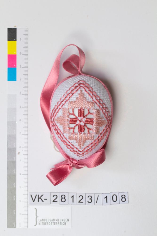Kunststoffei, umwickelt mit weißem Stoff, bestickt, Musterung: Hardanger-Stickerei in rosa, Motiv Quadrat, gefüllt; Borte in rosa (Trennung von Vorderseite und Rückseite) bildet gleichzeitig das Bändchen, verklebt und mit Masche verziert