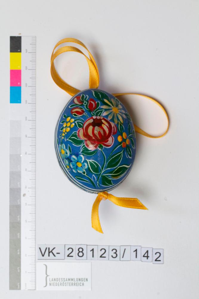 Hühnerei, ausgeblasen, bemalt, Musterung: auf blauem Grund üppiger Blumenstrauß, Borte (gemalt, Trennung zwischen Vorderseite und Rückseite), monogrammiert "LH", datiert "2001"; Bändchen: gelb, mit Knoten fixiert