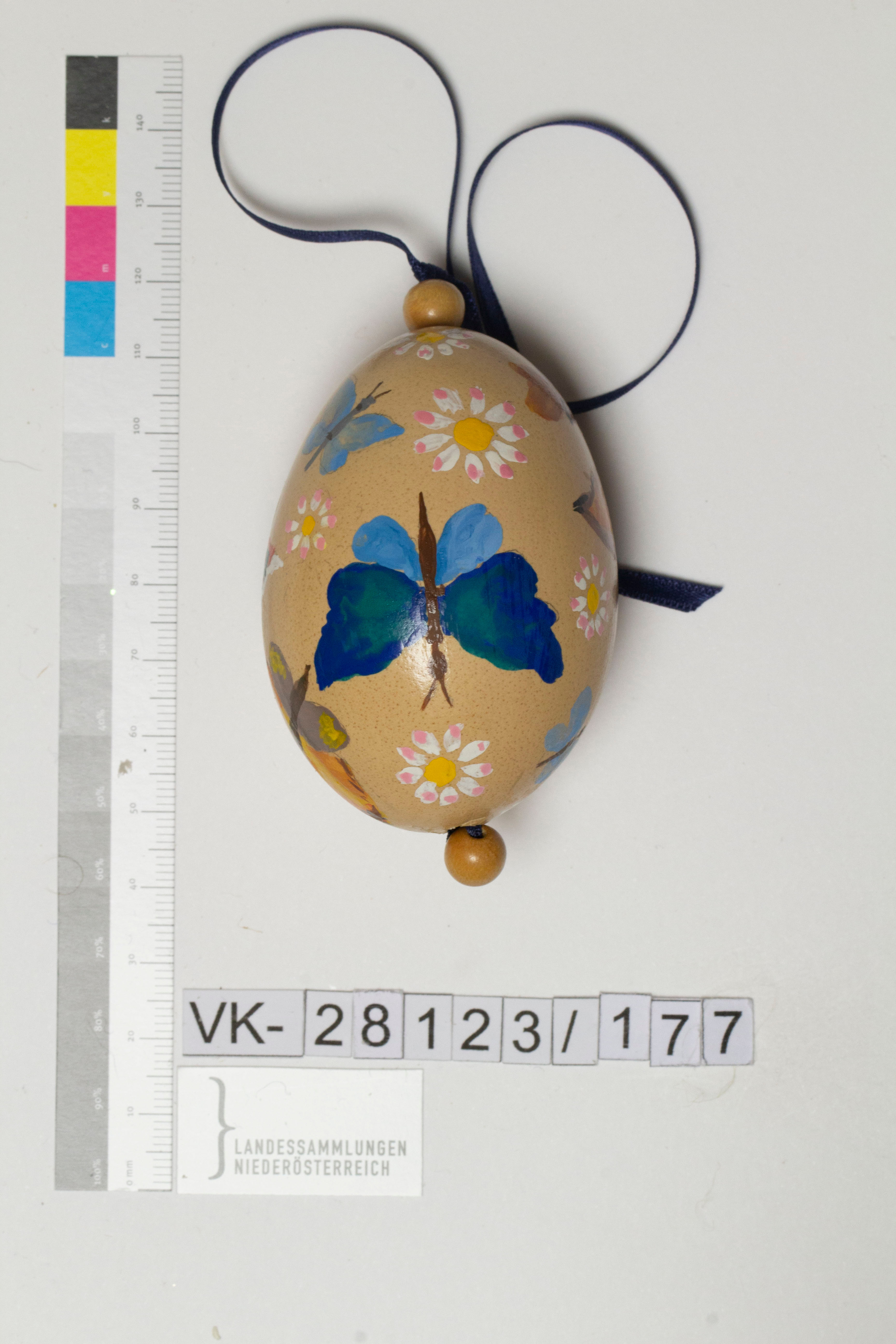 Hühnerei, ausgeblasen, naturbelassen braun, bemalt, Musterung: Schmetterlinge und Blüten, monogrammiert "le"; Bändchen: dunkelblau, mit Holzkugeln fixiert
