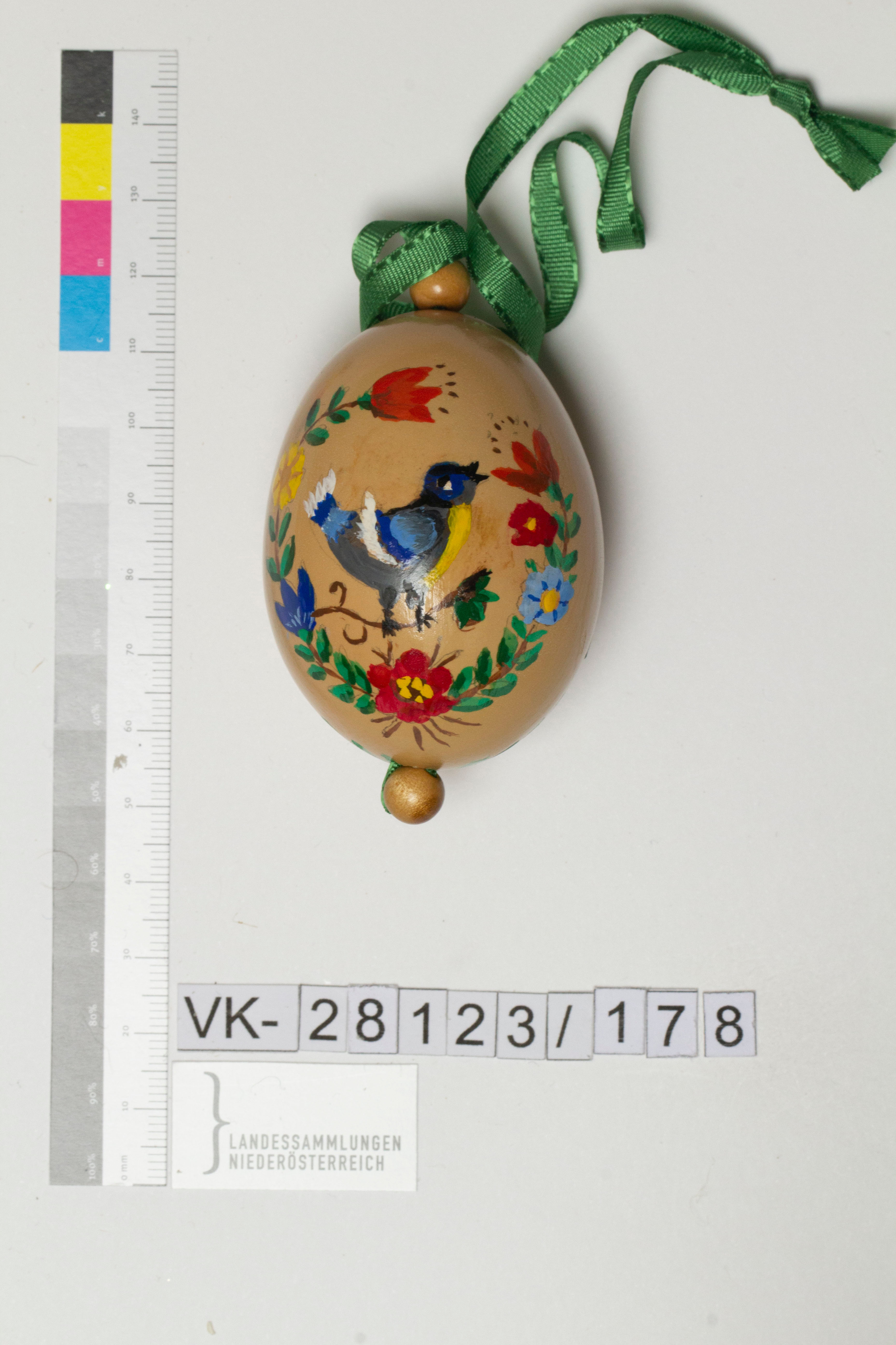 Hühnerei, ausgeblasen, naturbelassen braun, bemalt, Musterung: Blumen (kreisrund angeordnet), Ast mit Vogel, umrahmt von Blumenkranz, monogrammiert "LE"; Bändchen: grün, mit Holzkugeln fixiert