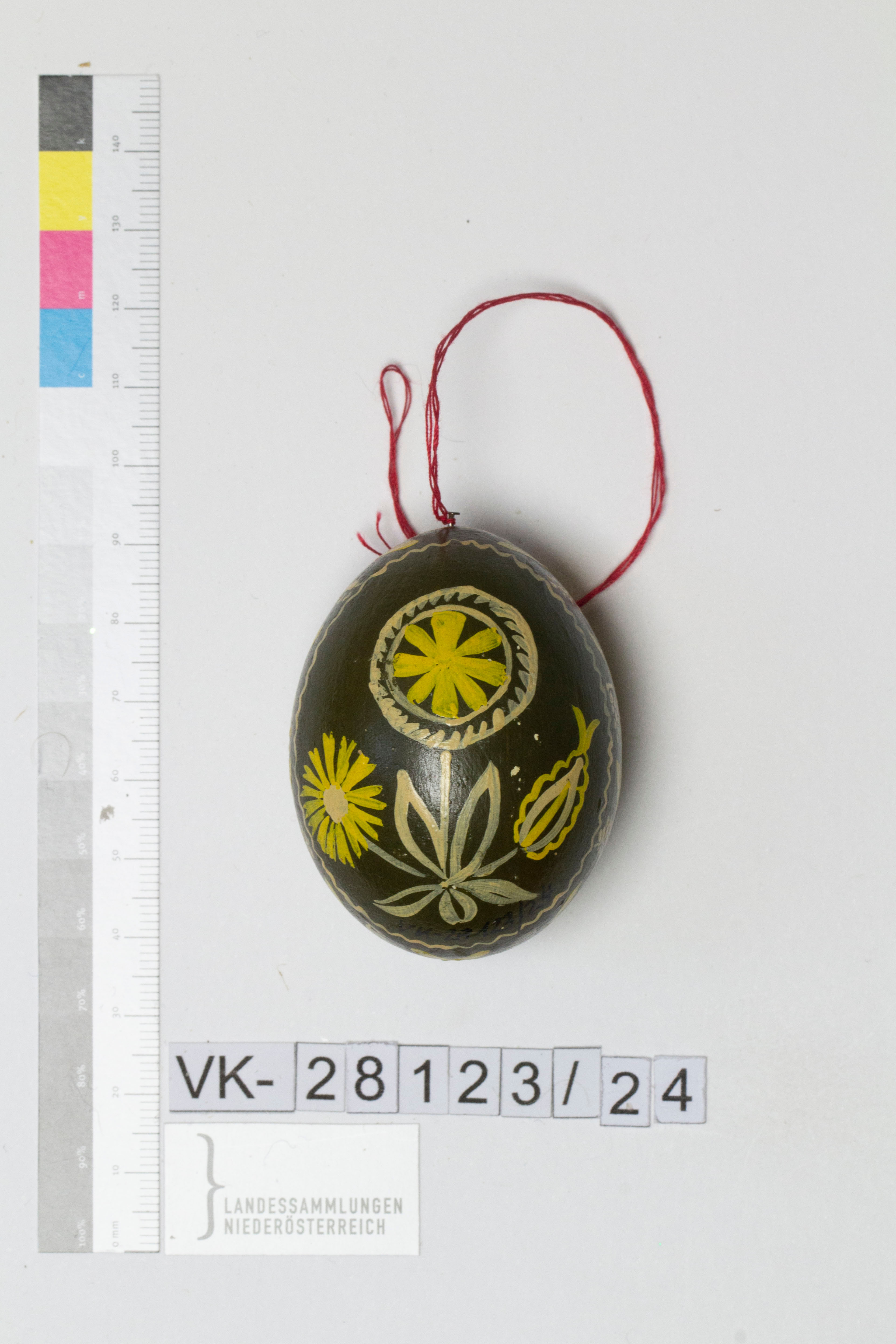 Holzei, bemalt, Musterung: auf olivgrünem Grund Strauß und Band aus stark stilisierten Blumen und Weinreben in gelb und weiß, herzförmig umrahmt Spruch "Viel Glück und Segen" in weiß und gelb