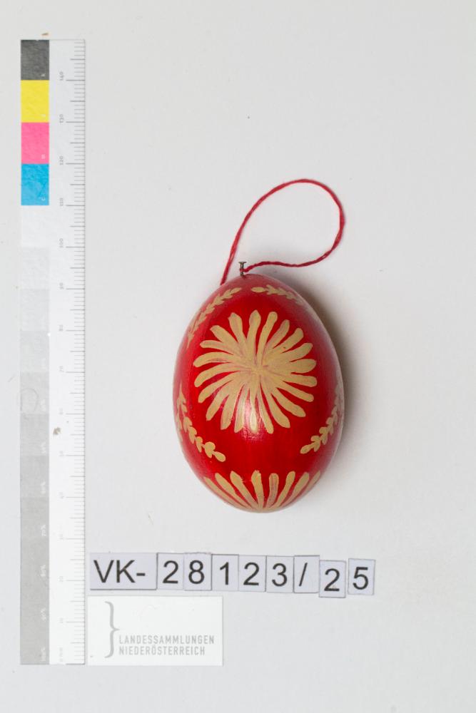 Holzei, bemalt, Musterung: auf rotem Grund stark stilisierte Blüten und Zweige in beige