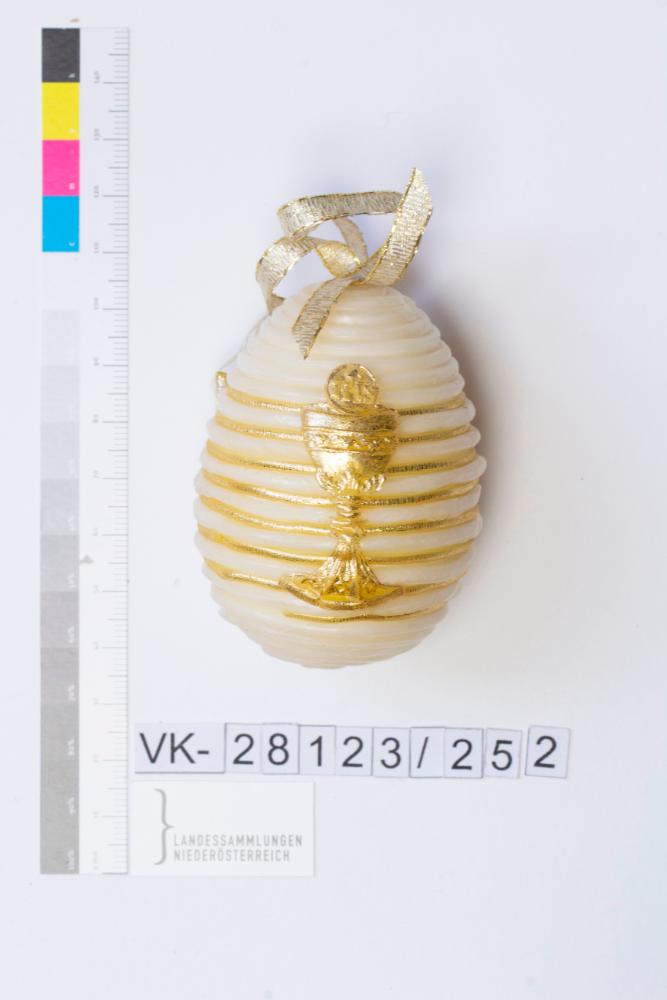 Kunststoffei, umwickelt mit Wachsschnüren in 2 verschiedenen Stärken - die dünnen Schnüre im Mittelteil gold bemalt; auf der Vorderseite Kelch mit Hostie (aus Wachs, gold bemalt) verklebt; Bändchen: gold, mit Nadel fixiert