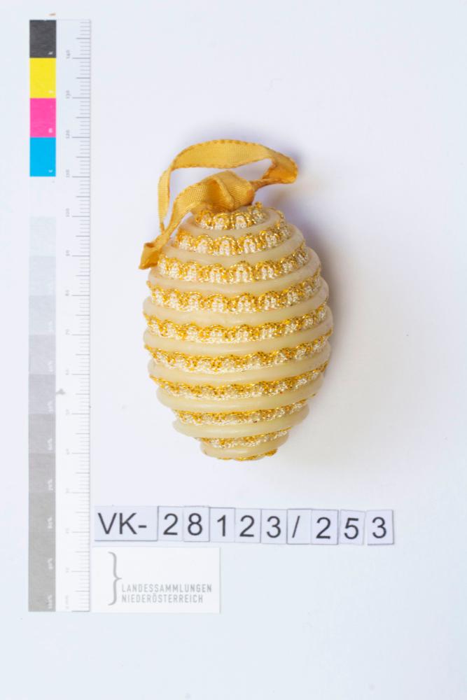 Kunststoffei, umwickelt alternierend mit Wachsschnüren und Borten (Posamentier); Bändchen: gelb, mit Nadel fixiert