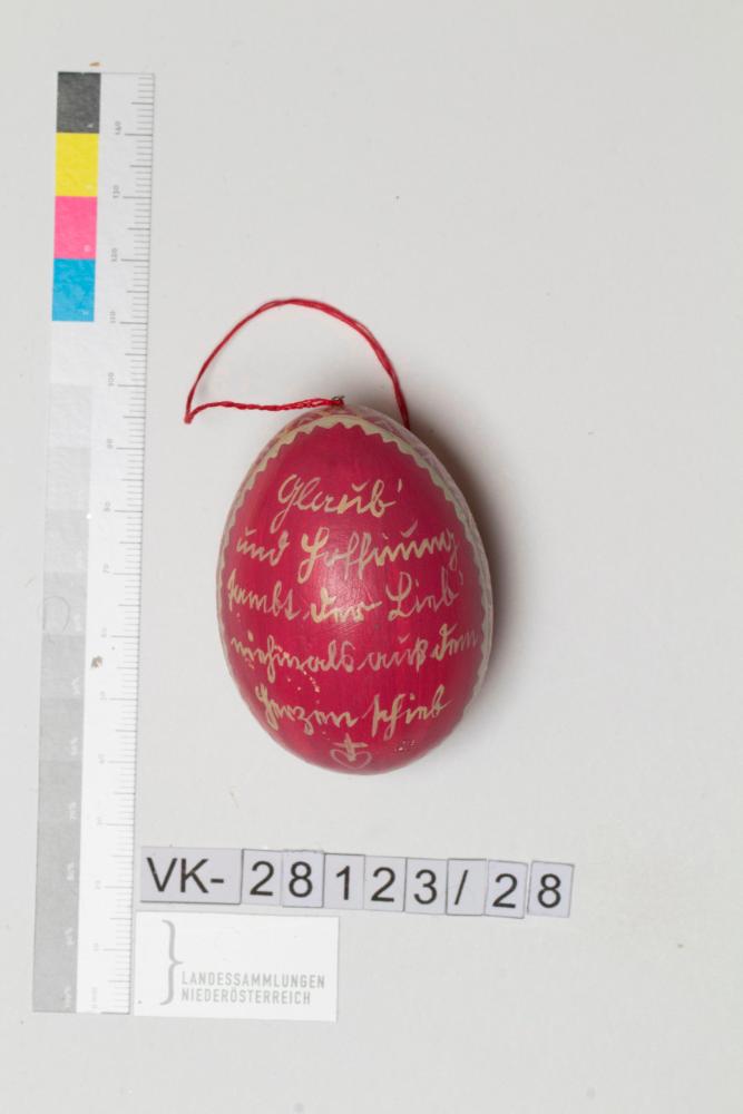Holzei, bemalt, Musterung: auf magentafarbenem Grund Spruch in weiß auf Vorder- und Rückseite "Glaub der Kirch, vertrau auf Gott, liebe ihn bis in den Tod", darunter Anker; "Glaub`und Hffnung sambt der Lieb`niehmals aus dem Herzen schieb", darunter Herz mit Kreuz; Band aus Blattornamenten in gelb, weiß
