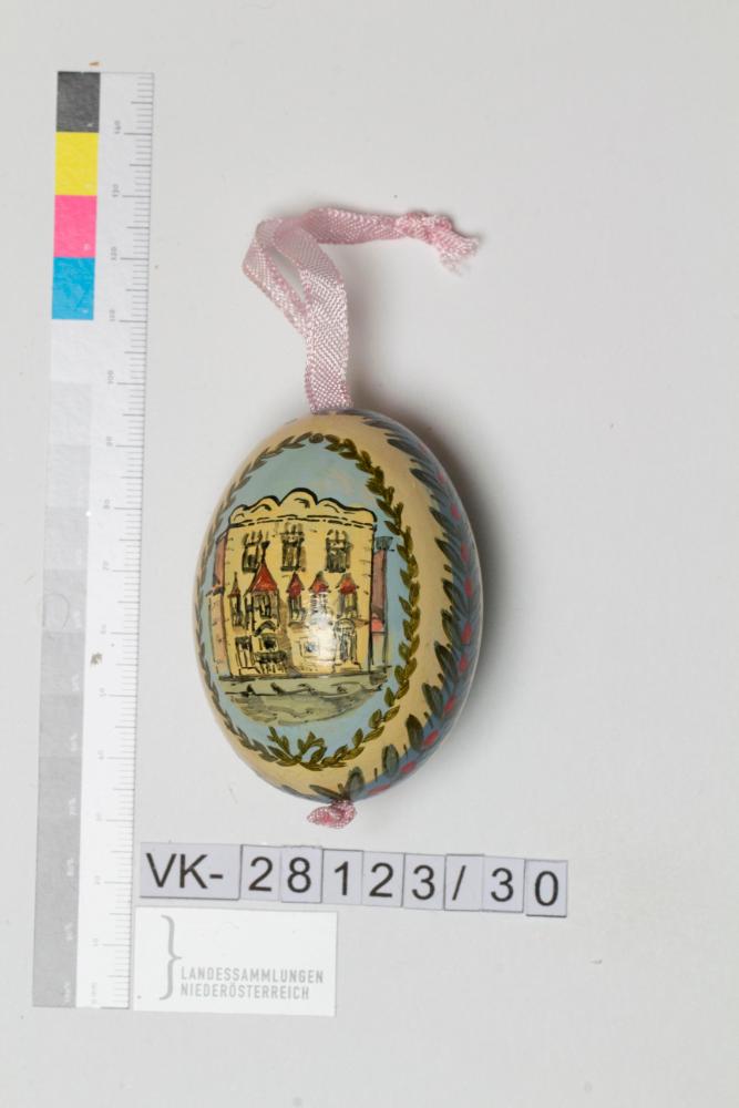 Hühnerei, ausgeblasen, bemalt, Musterung: Vorderseite: auf hellblauem Grund (oval, umrahmt von Blättern) Spruch "Ach, wie wäre es schön, würd`s Porksteinerhaus noch steh`n; es wär`die Perle unsrer Stadt, die nicht ihresgleichen hat"; Rückseite: auf hellblauem Grund (oval, umrahmt von Blättern) Haus; Band aus Blättern und Früchten; Bändchen: Stoff hellrosa, mit Knoten fixiert