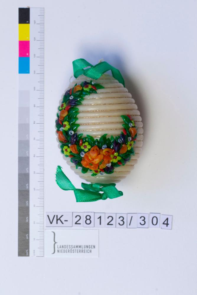 Hühnerei, ausgeblasen, umwickelt mit Wachsschnüren, zwischen den Wachsschnüren dünnes Goldschnürchen verklebt, auf der Vorderseite üppiger Blumenkranz (aus buntem Wachs) verklebt; Bändchen: grün, mit Masche fixiert