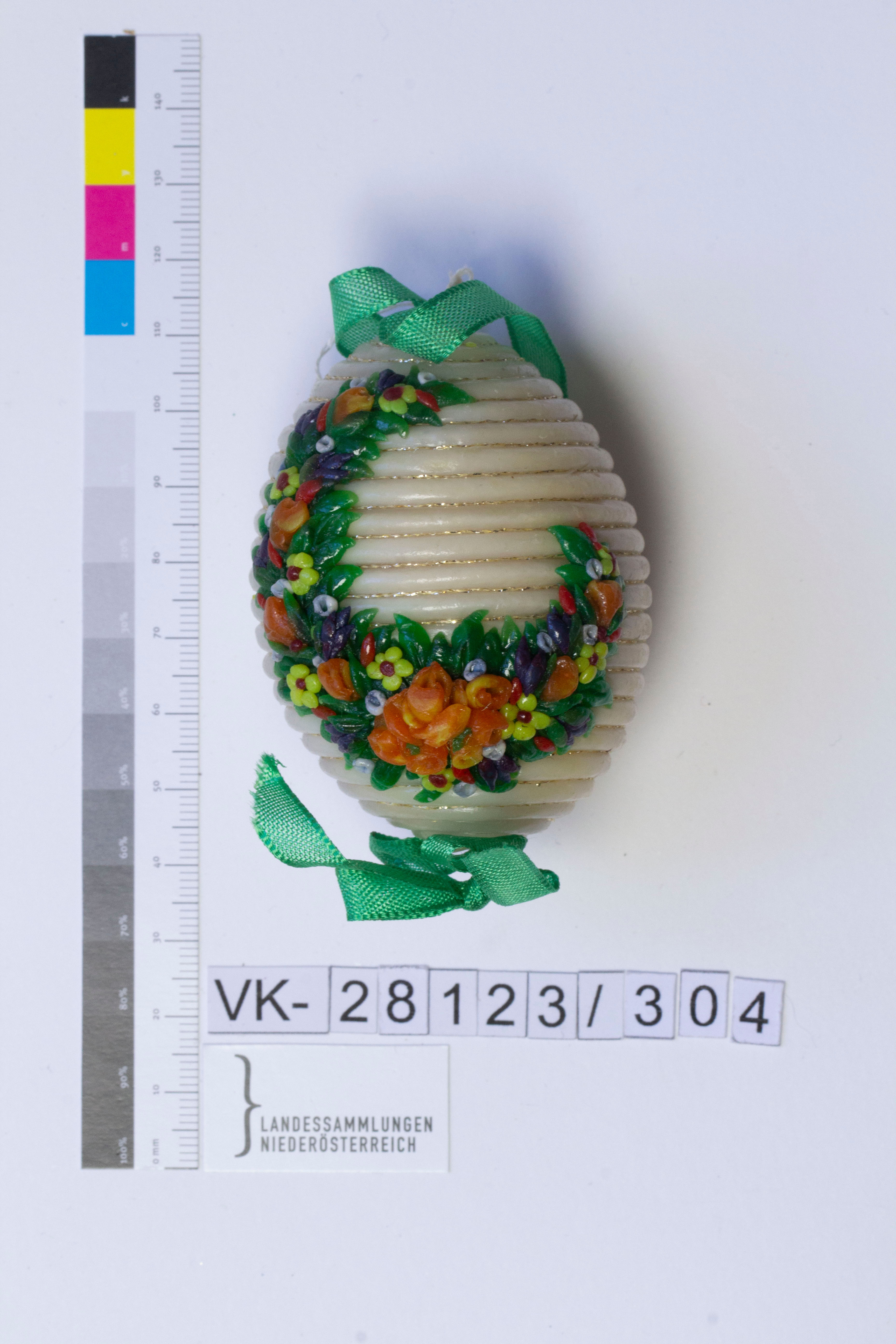 Hühnerei, ausgeblasen, umwickelt mit Wachsschnüren, zwischen den Wachsschnüren dünnes Goldschnürchen verklebt, auf der Vorderseite üppiger Blumenkranz (aus buntem Wachs) verklebt; Bändchen: grün, mit Masche fixiert