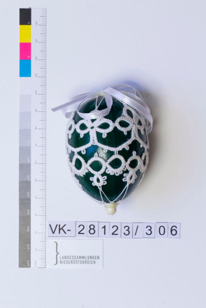 Kunststoffei, grün bemalt, umwickelt mit Occhispitze aus weißem Garn, Musterung: durchbrochen, Bogen ergeben Blütenornamente, Kreise; Bändchen: weiß, mit Masche und Holzkugel fixiert