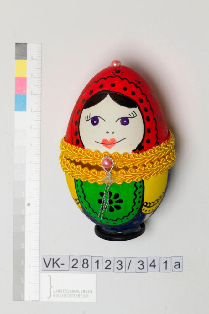 Entenei mit Standfläche = Babuschka -Ei, 4 teilig, ausgeblasen, aufklappbar, bemalt, Musterung: typische Bemalung der ineinandergesetzten Babuschka-Puppen, Perle mit Schlaufe als Verschluss, Loch zum Ausblasen des Eies mit Perle verschlossen, Standfläche aus Kunststoff schwarz, Borte als Verzierung der Ränder der beiden Eihälften