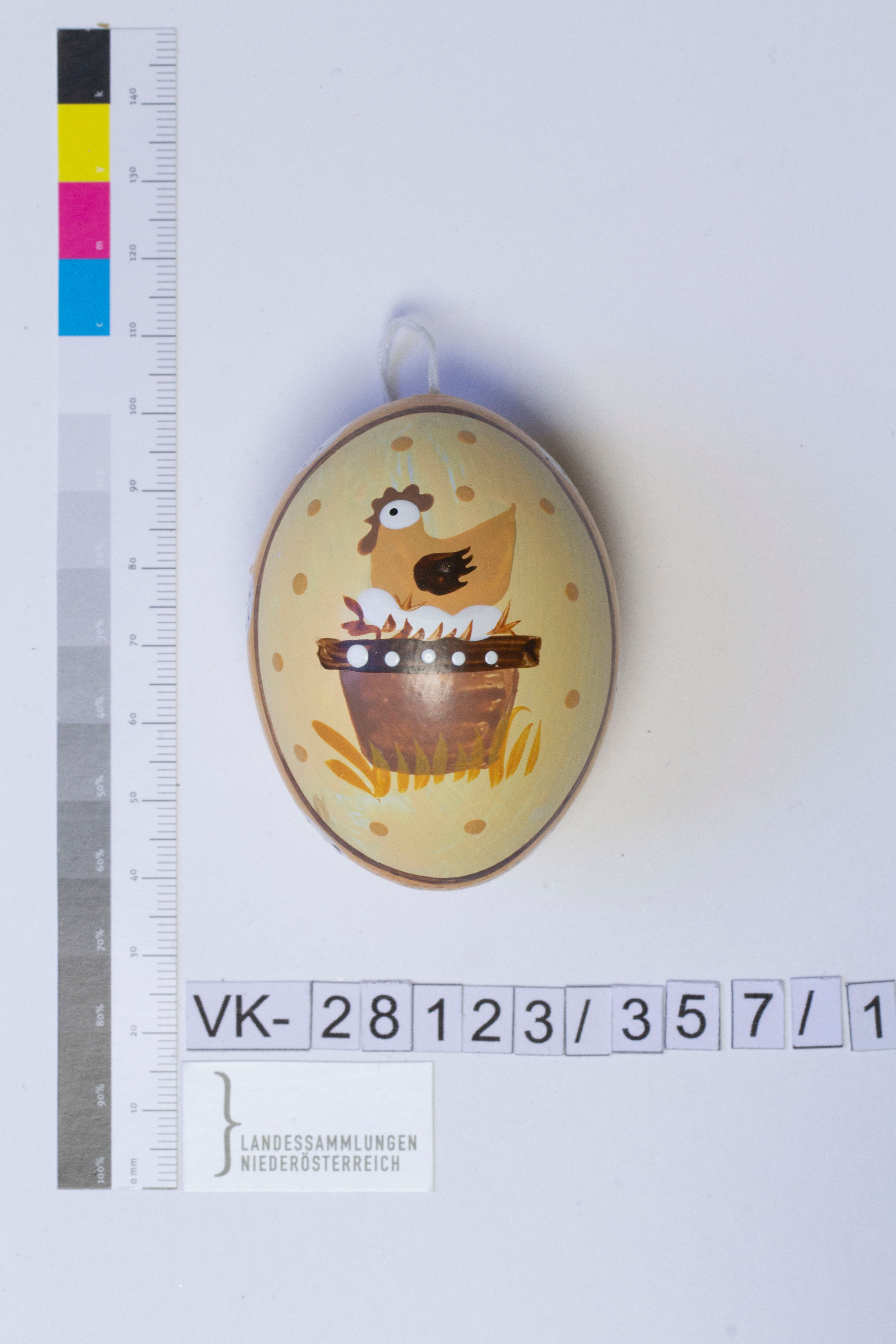 Hühnerei, ausgeblasen, bemalt, Musterung: auf gelbem Grund Eier (weiß) zwischen Grashalmen (braun), auf gelbem Grund Topf (braun) mit Henne (beige) auf Nest mit Eiern (weiß) brütend, zwischen Vorderseite und Rückseite beiges Band mit Eiern (weiß, schwarz gepunktet) gemalt; Bändchen: Garn, mit Kleber fixiert
