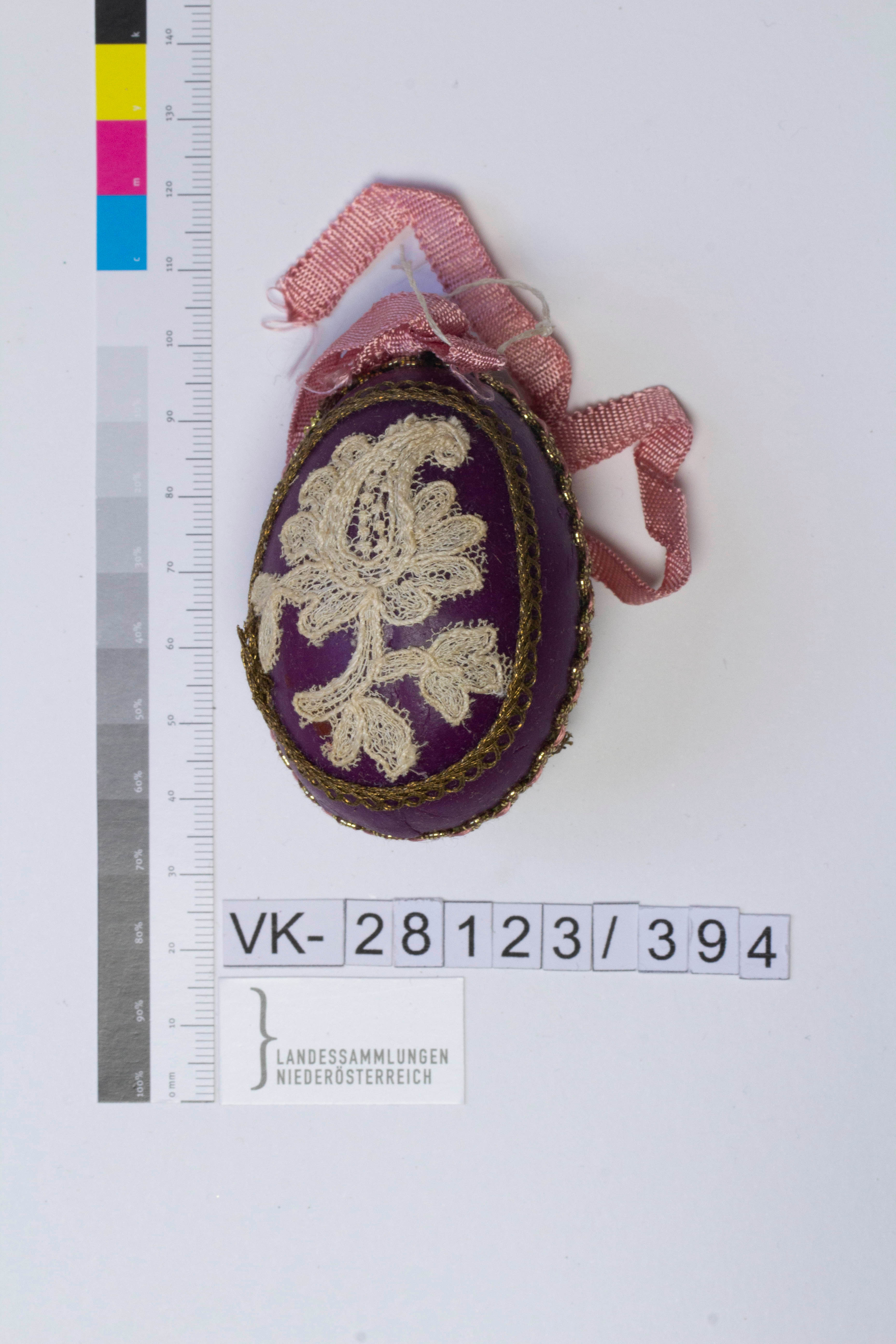Kunststoffei (Styropor), umwickelt mit Wachs in violett, Musterung: Motive in Spitzentechniken (ausgeschnittene Blume) auf Wachs appliziert, Goldborten (Posamentier) als Umrandung der Applikationen und Trennung der Vorderseite und Rückseite aufgeklebt; Bändchen: rosa, mit Masche und Nadel fixiert