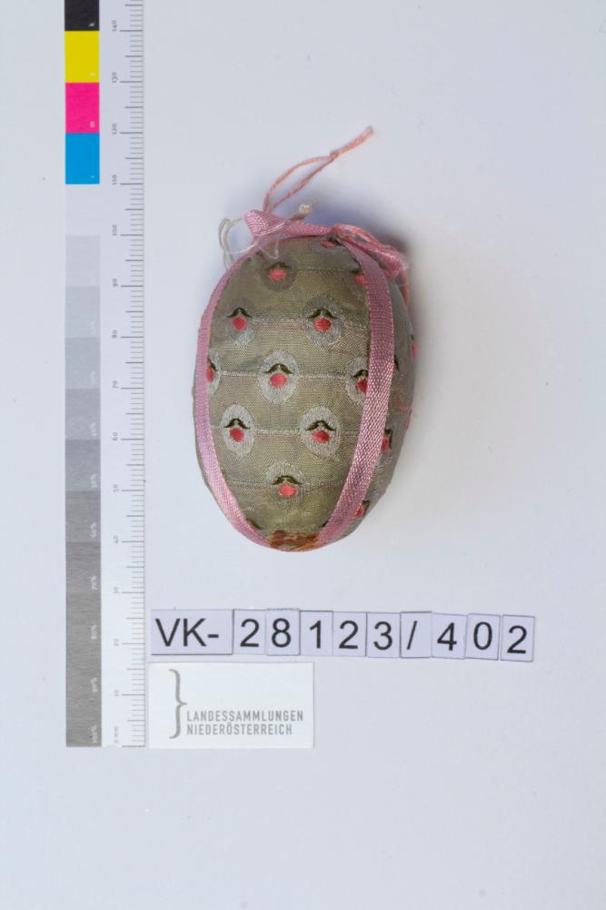 Kunststoffei (Styropor), umwickelt mit Stoff, Musterung: Damast aus Seide in hellgrün mit stark stilisierten Blumenmotiven in grün und rosa gemustert; rosa Band aufgeklebt und mit Masche am Eiende fixiert; Bändchen: Garn rosa