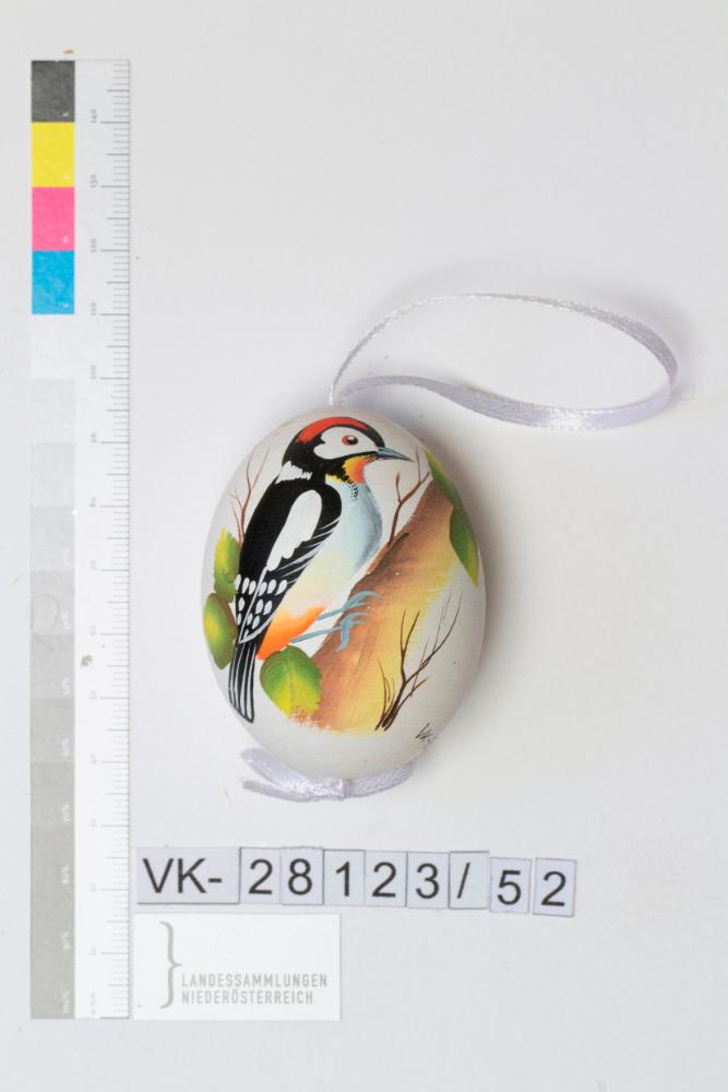 Hühnerei, ausgeblasen, naturbelassen weiß, bemalt; Musterung: Teil eines Baumstammes mit Vogel (Buntspecht); Teil eines Baumstammes; Bändchen: in weiß, mit Masche fixiert