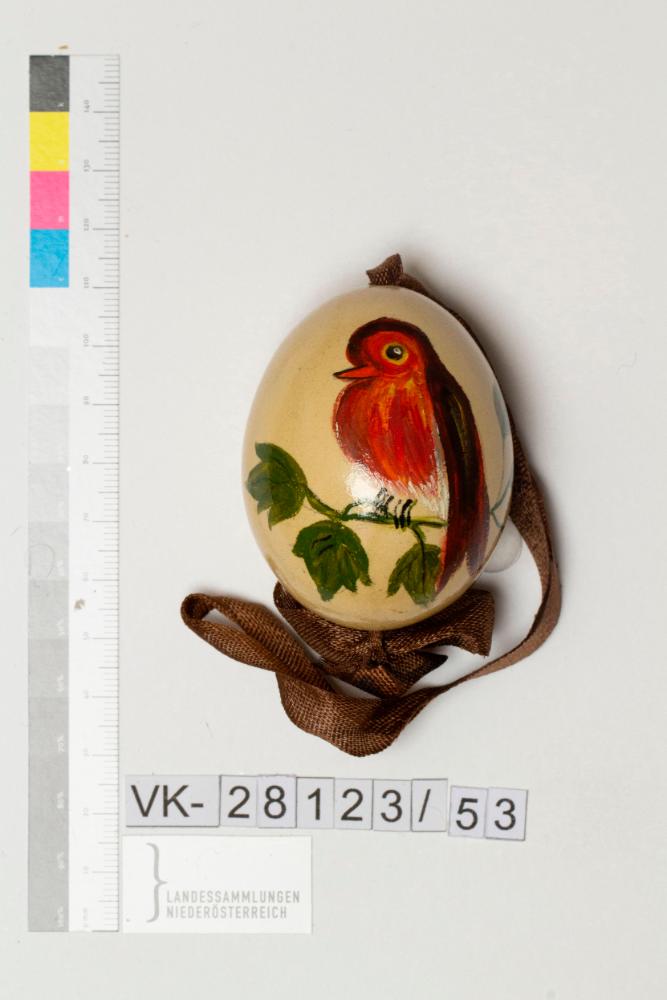 Hühnerei, ausgeblasen, naurbelassen braun, lackiert, bemalt; Musterung: Teil eines Astes mit Vogel; Bändchen: in braun, mit Masche fixiert